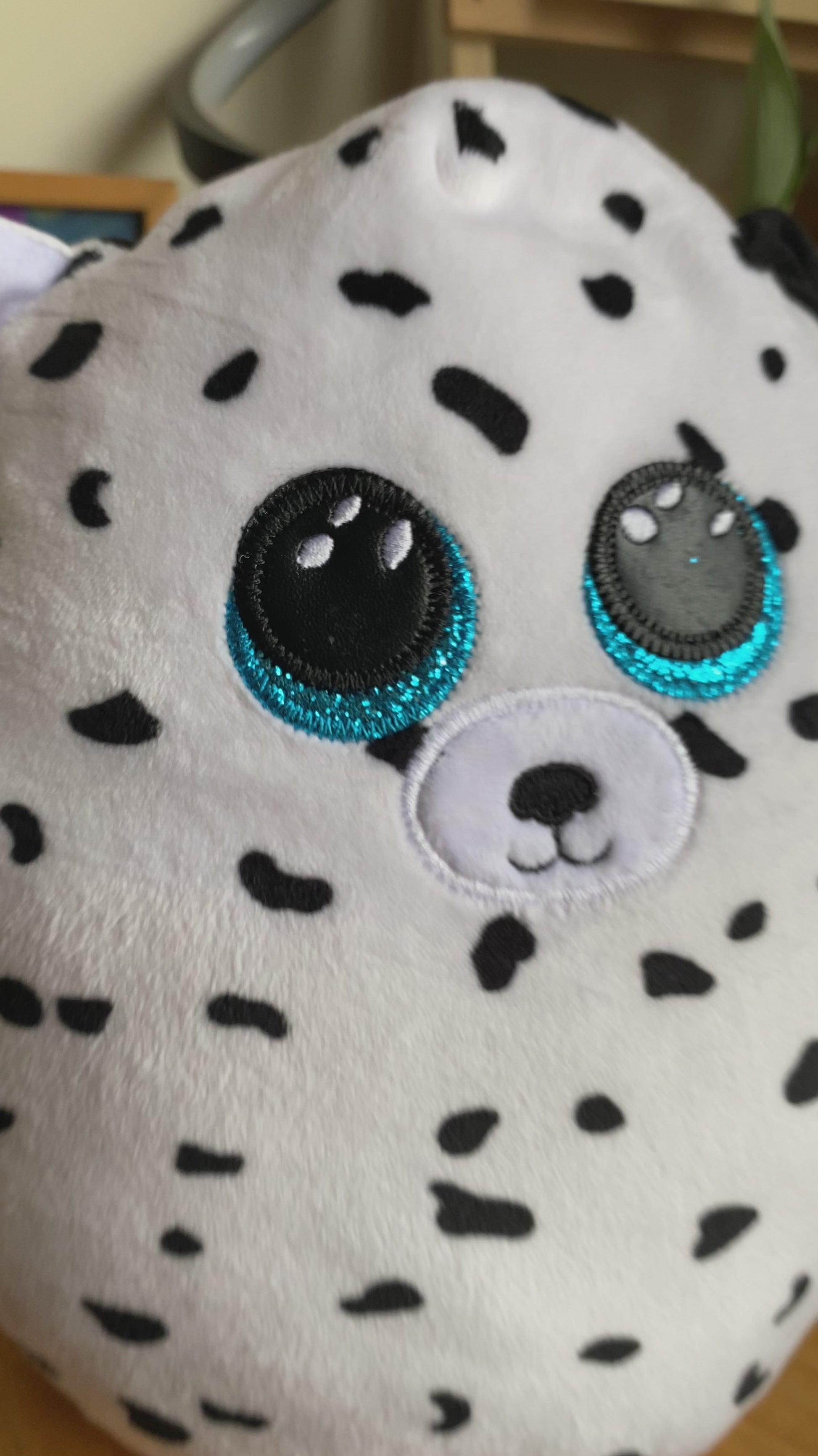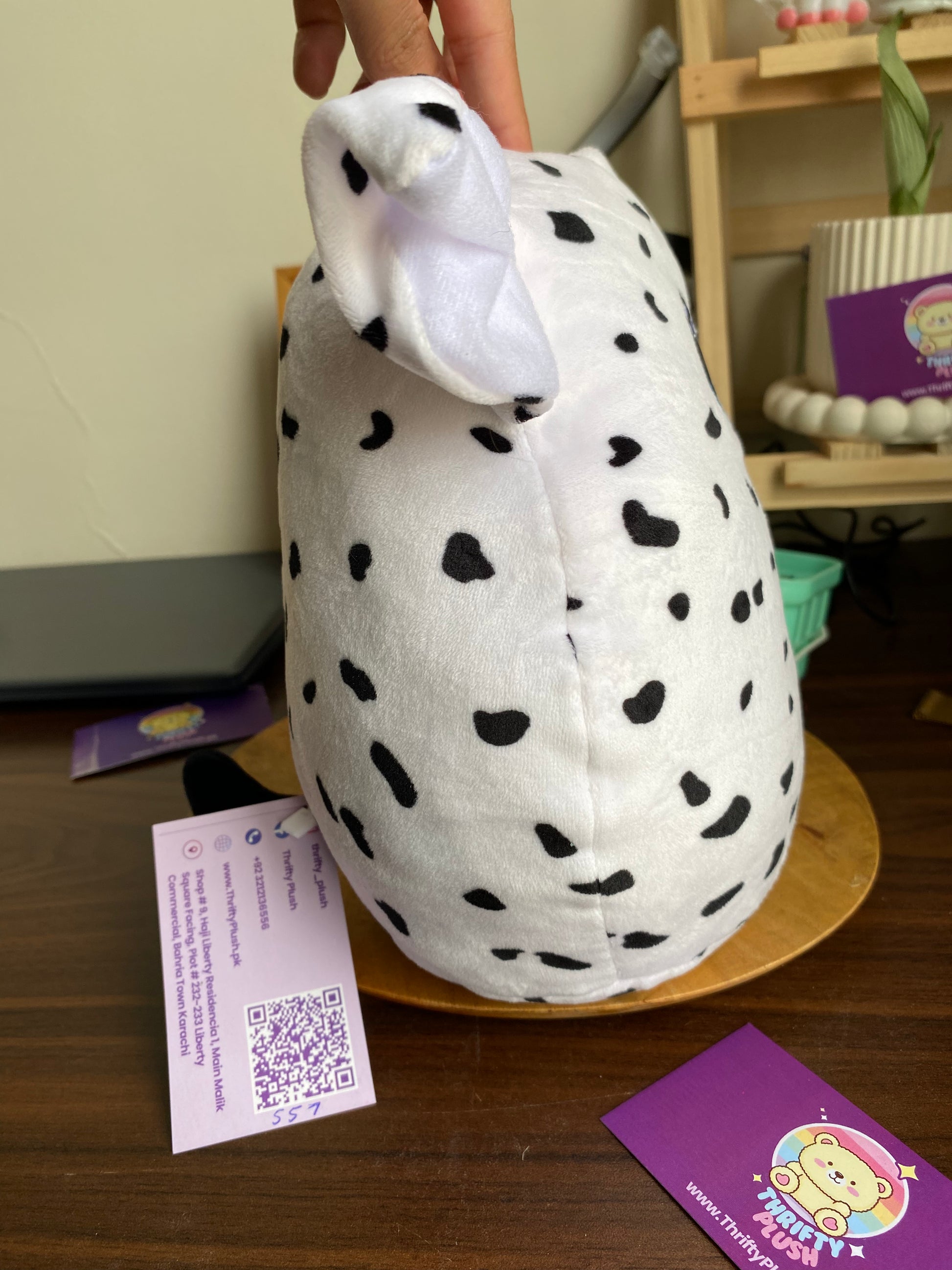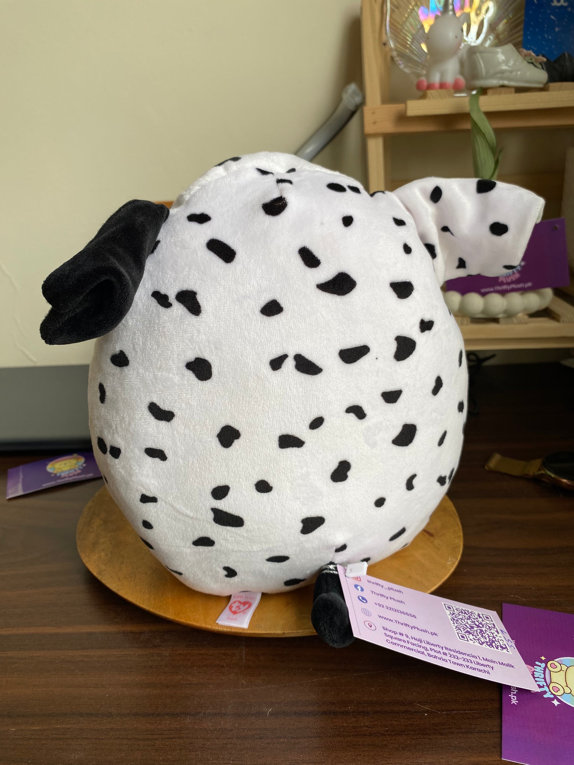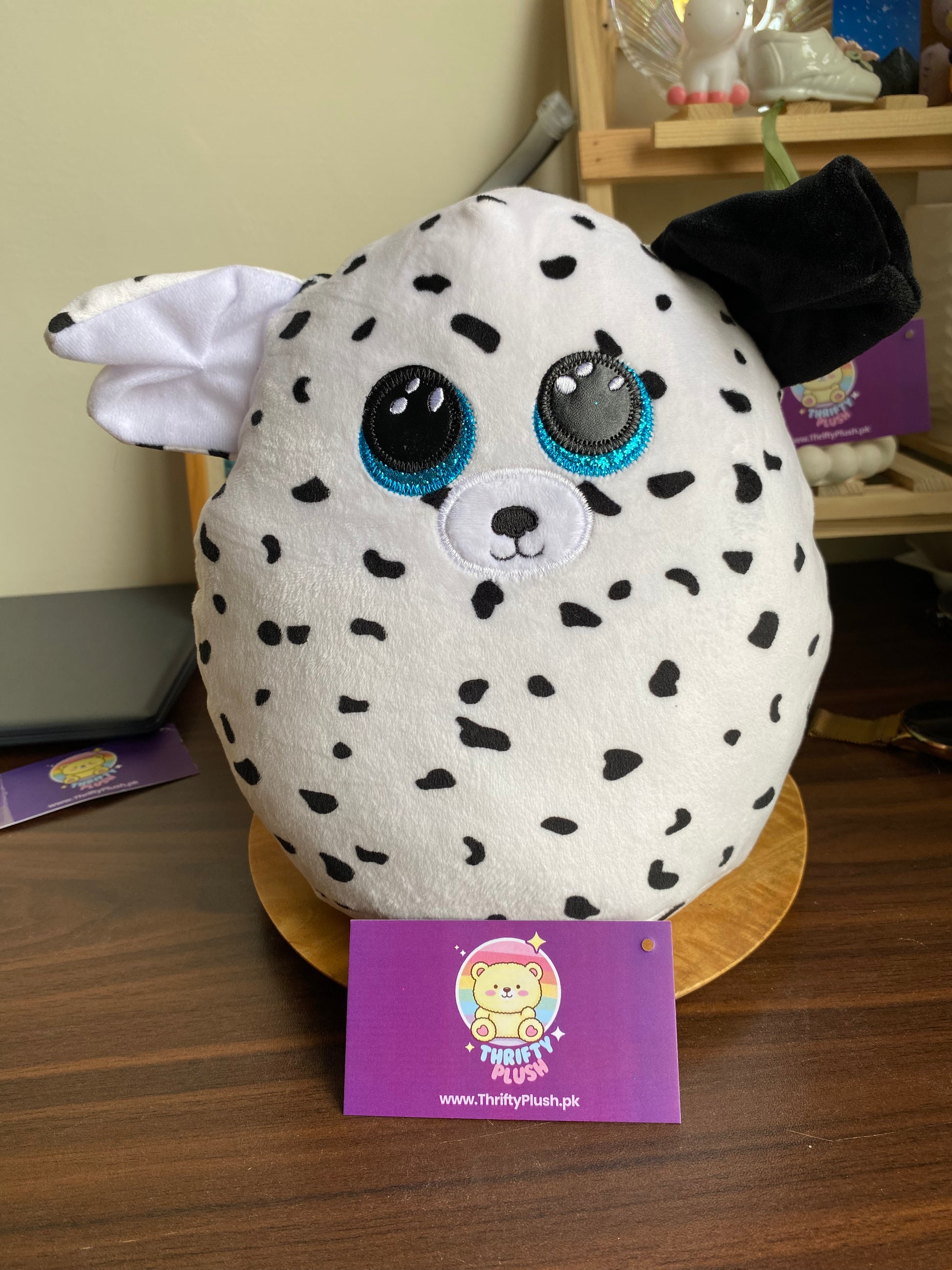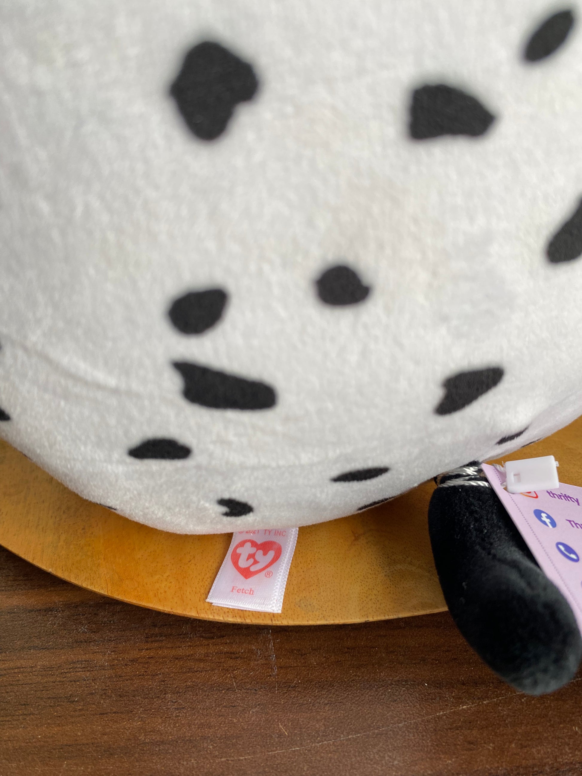 Dalmatian-themed plush toy from the Ty Squish. Fetch is a black and white Dalmatian dog with blue eyes and one black ear
