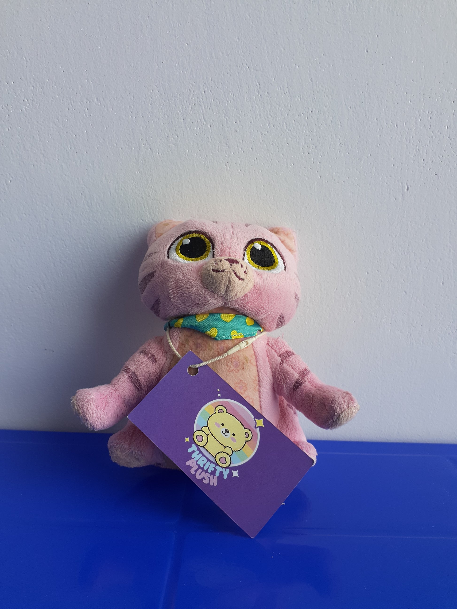 "Disney Jr. Doc McStuffins Whispers Pink Kitty Cat" plush toy. It is a character from the animated series "Doc McStuffins," which features a young girl who cares for and "heals" her toys.