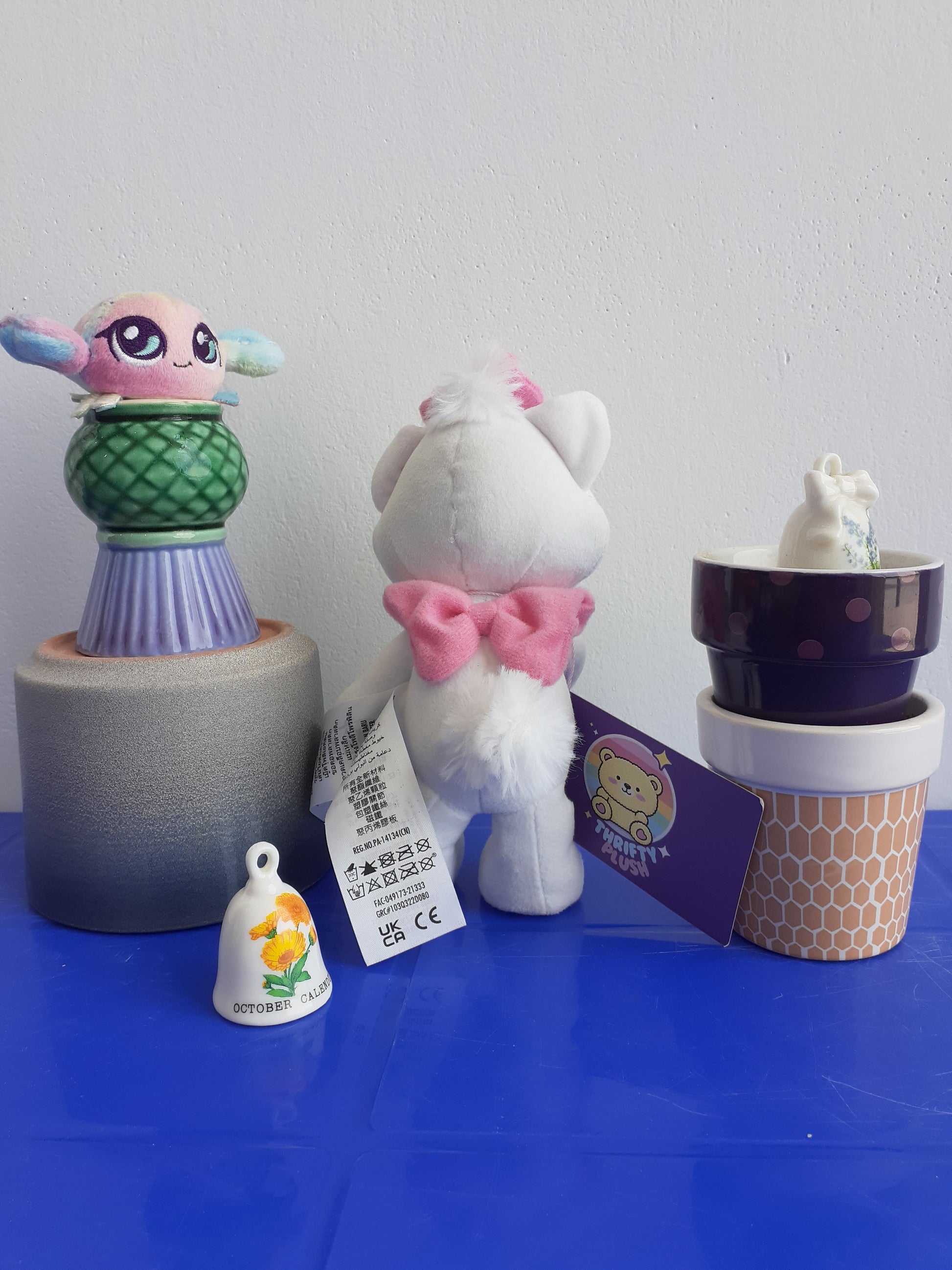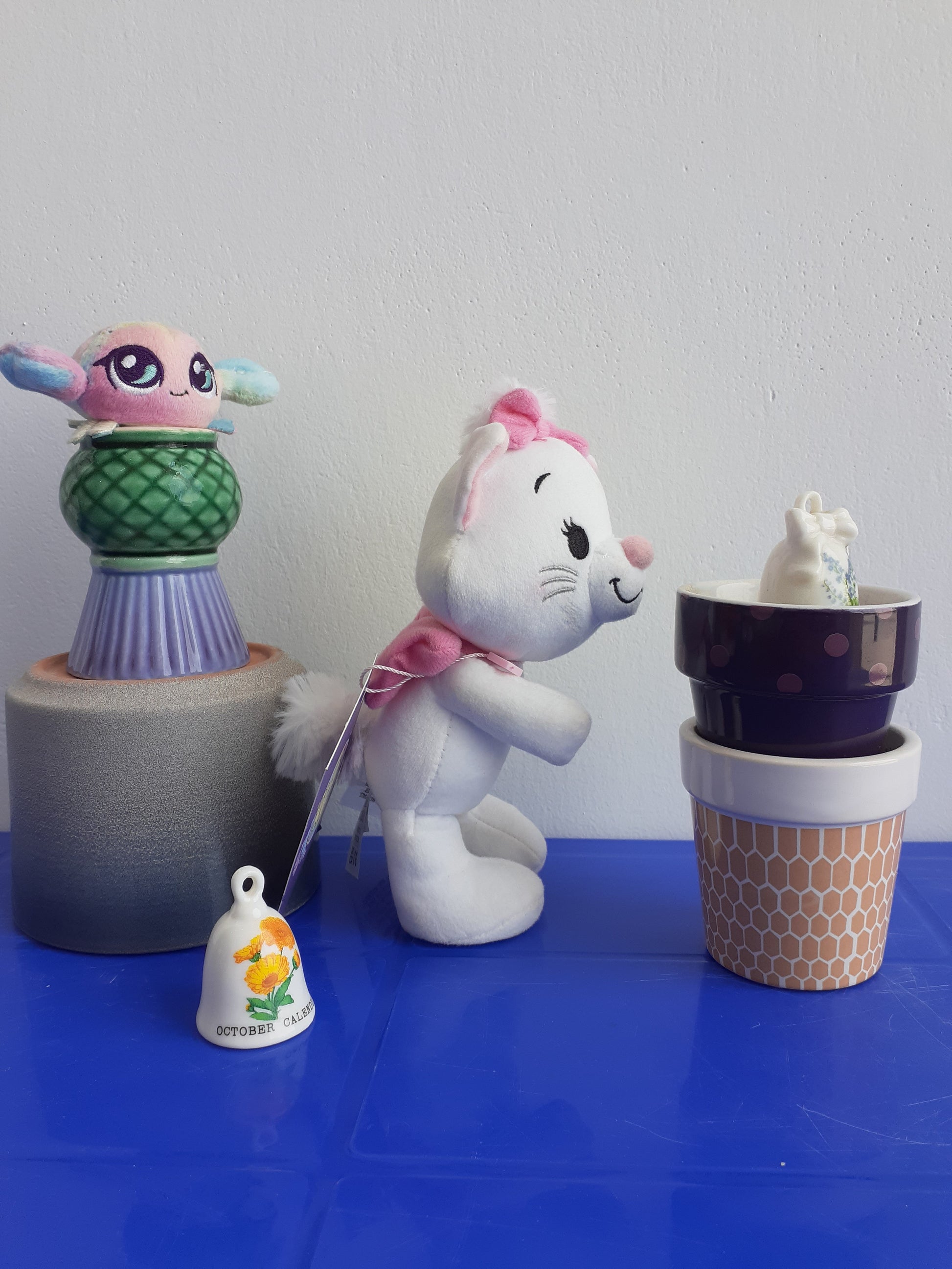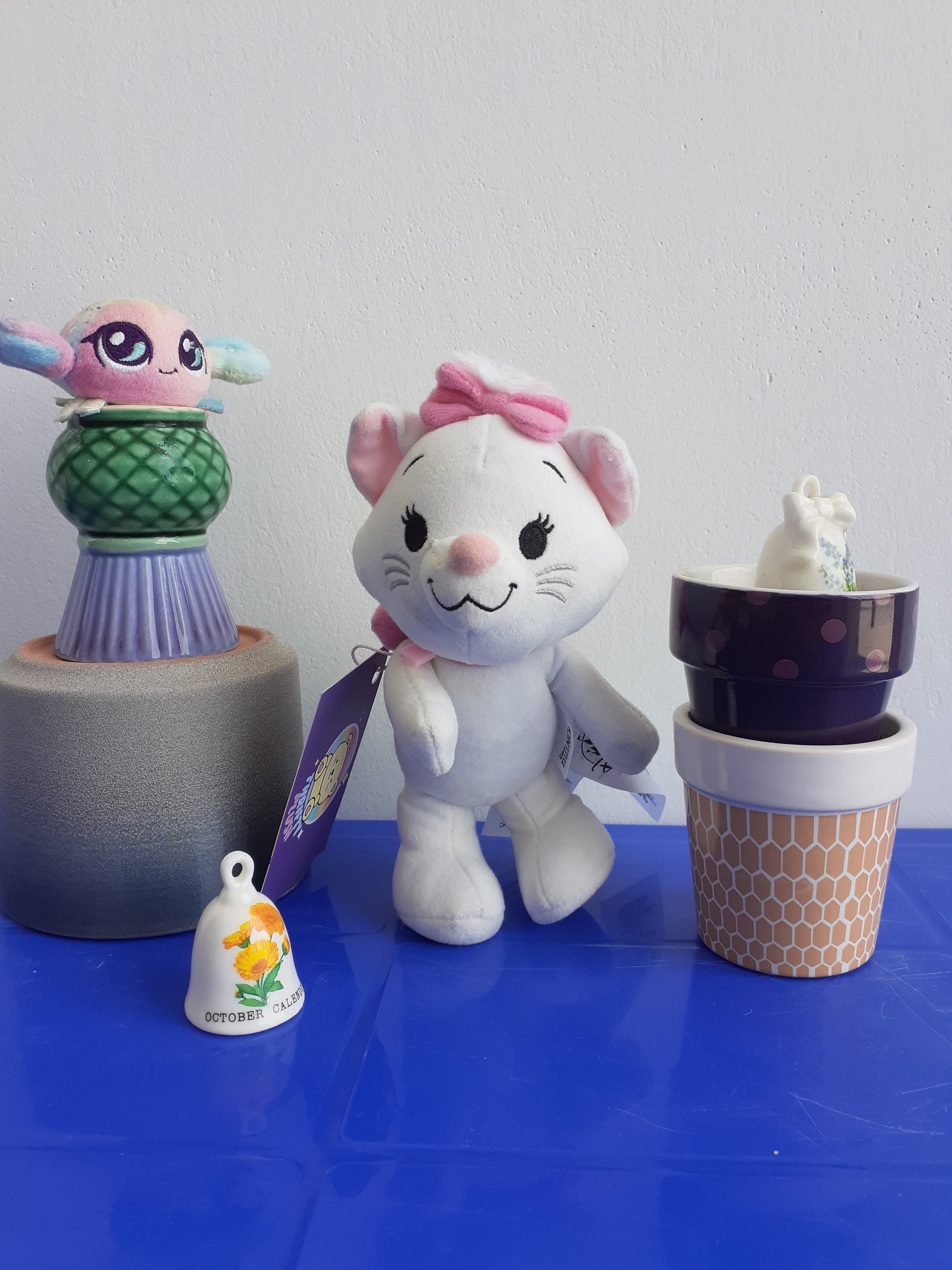 Disney Store Marie nuiMOs Small Soft Toy from The Aristocats. These plush toys are designed in Japan and are known for their cute, cuddly nature and the ability to be dressed in various outfits. This Marie plush is about 6 1/3 inches in height, with embroidered features, poseable limbs, and magnets in the hands to hold accessories or other nuiMOs. The plush is made from polyester, with a polypropylene stiffener, plastic-coated wire, and magnets inside. The toy is suitable for ages 6 and up.