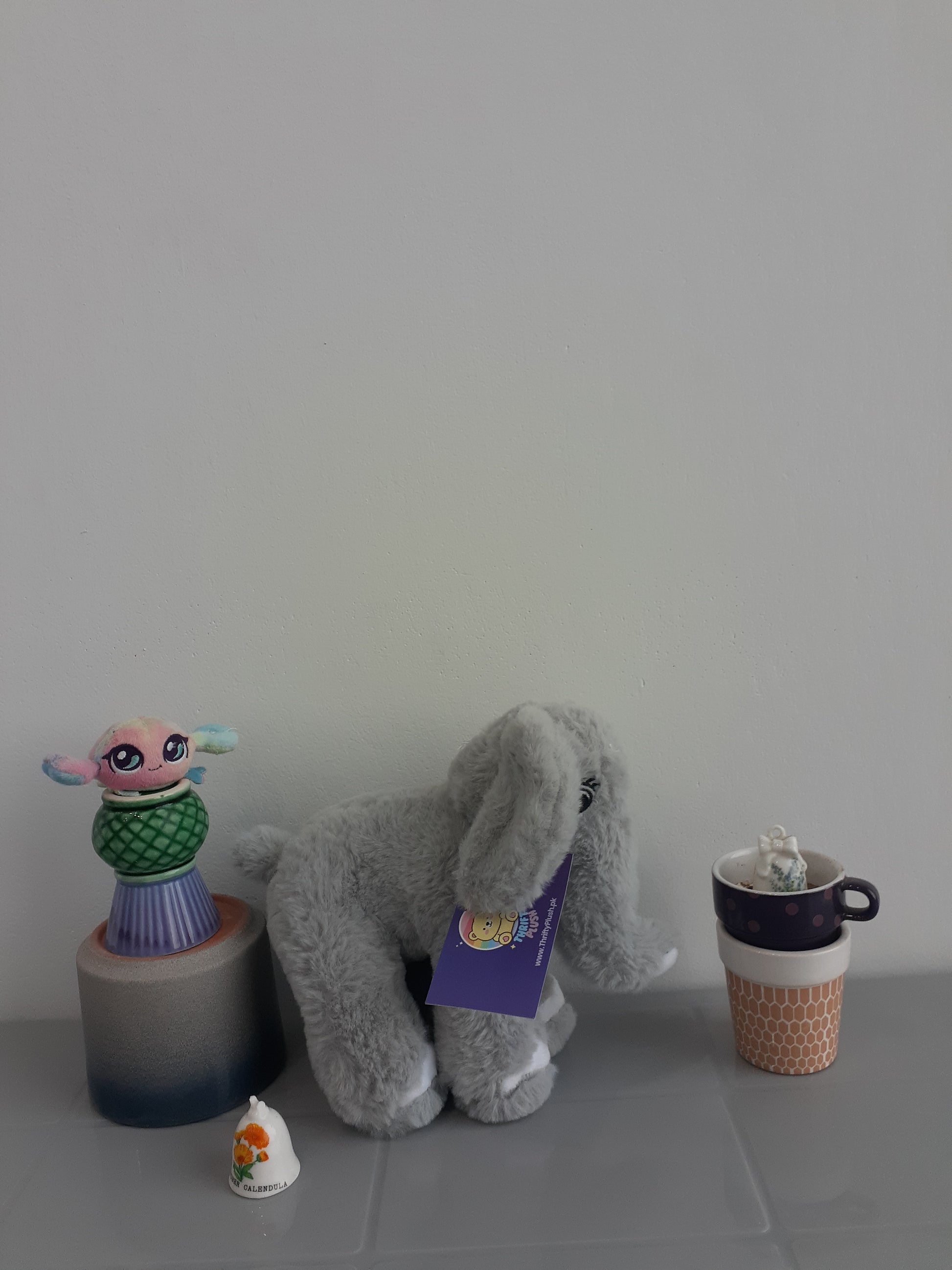 gray elephant plush toy. These toys are made from a soft fabric and filled with flexible material, making them cuddly. They are often referred to as plushies, stuffies, or soft toys.