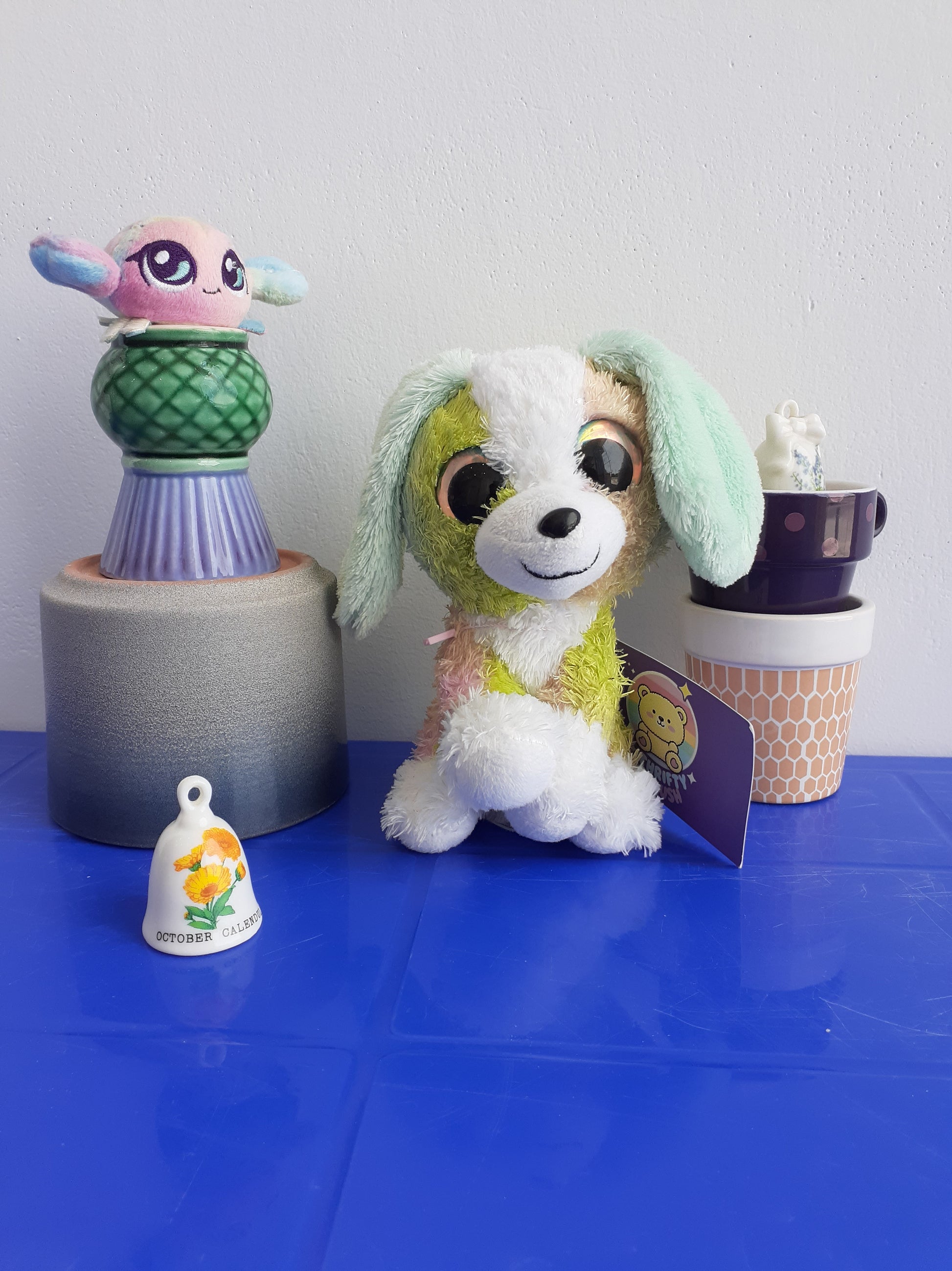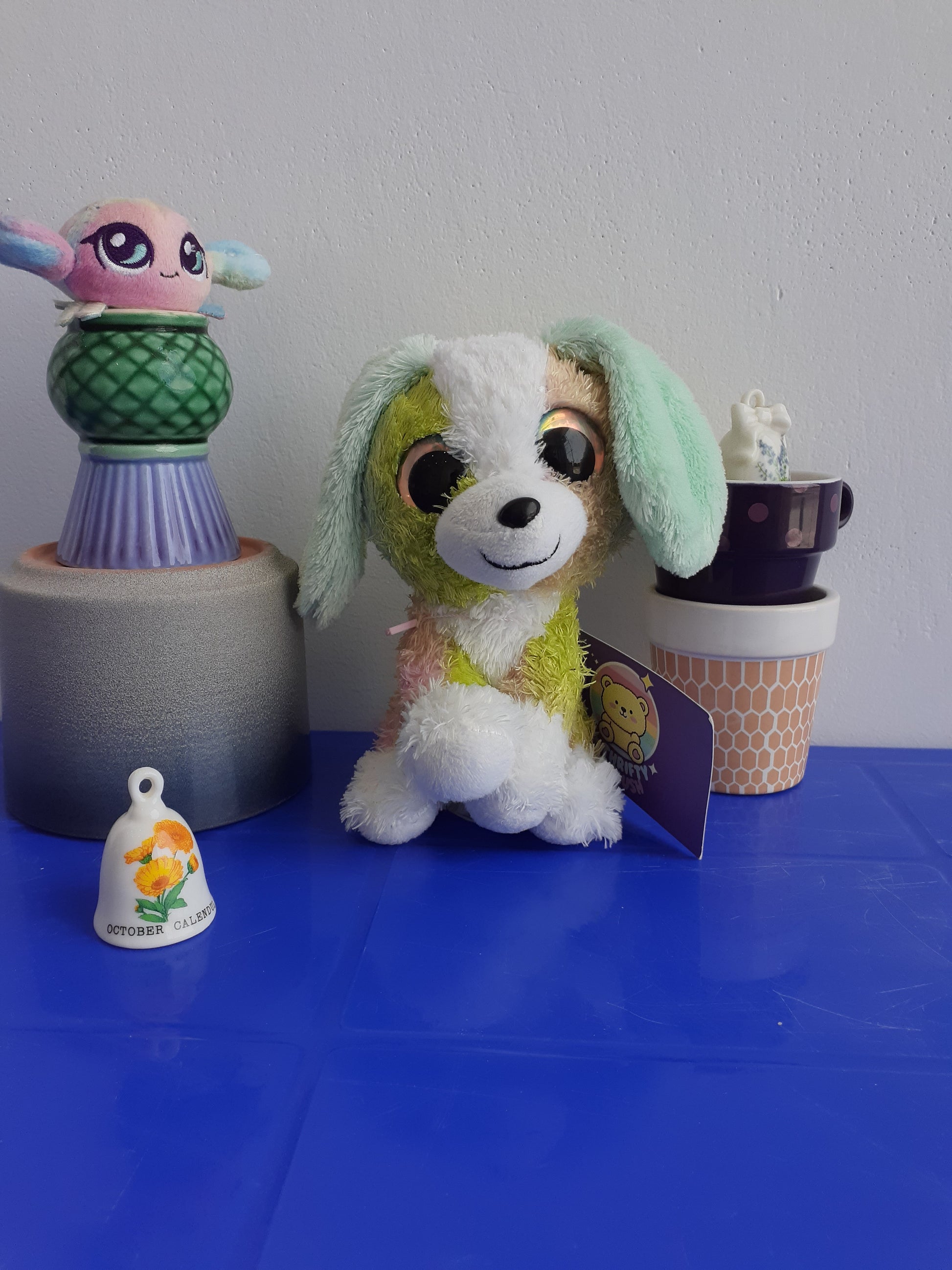 Lumo Stars Spotty Dog plush toy, which is part of a collection of soft toys inspired by Nordic nature, known for their large, sparkling eyes and soft fur. This particular toy is characterized by its white, green, and pink fur, and it's designed to be huggable.