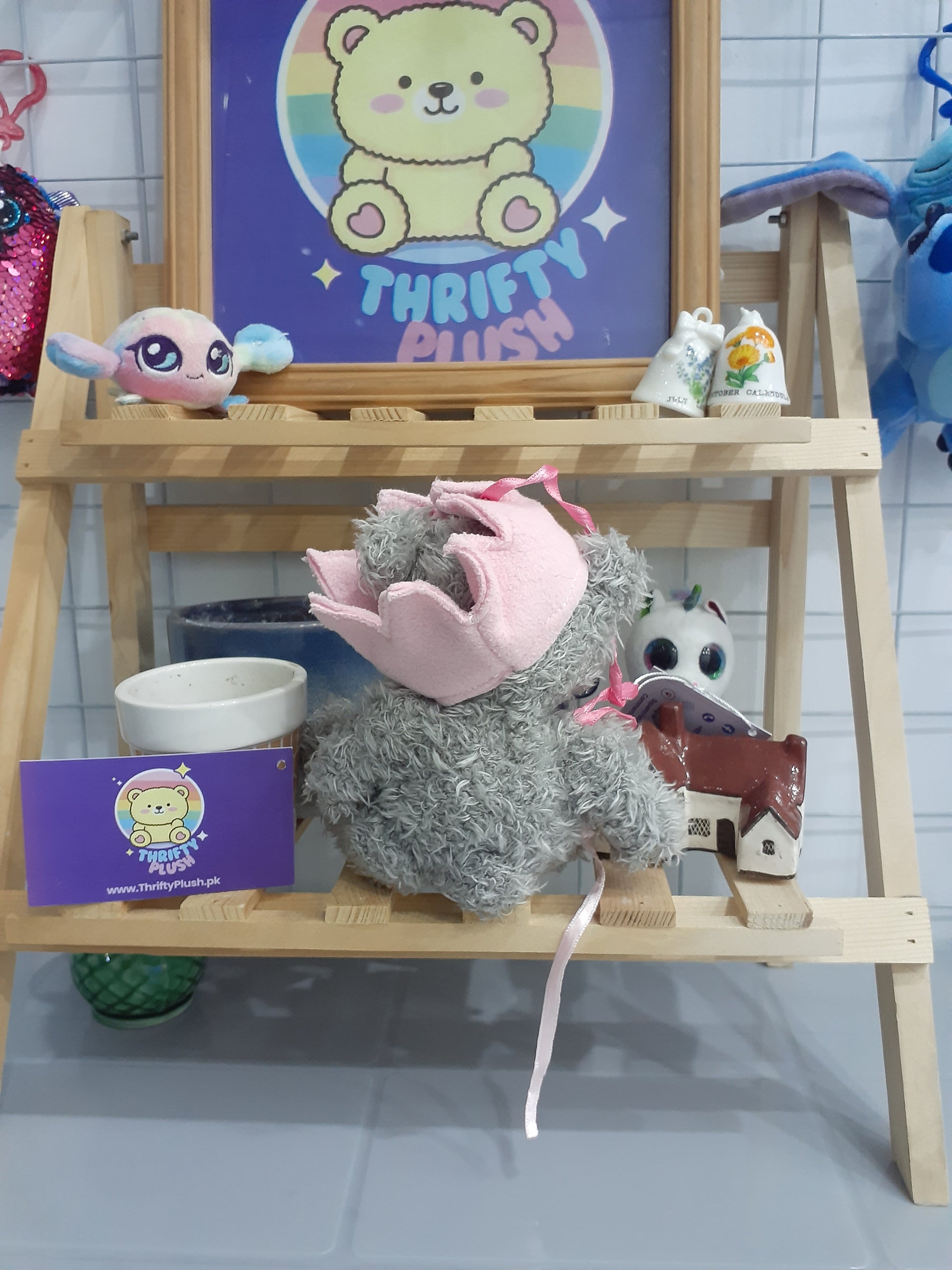 Features: The bear has hand-sewn patches and a cute blue nose.