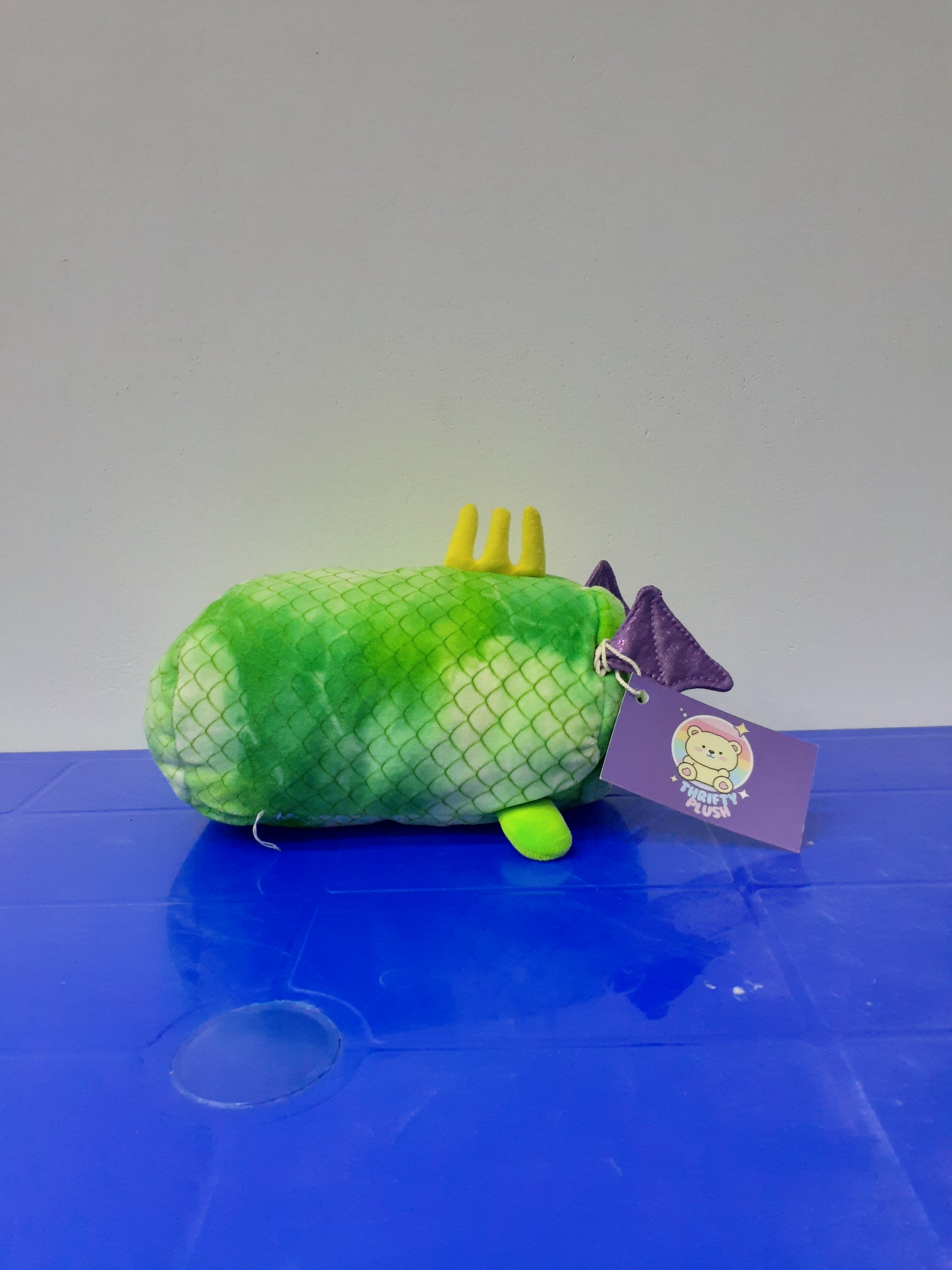 Moosh Moosh Byron plush toy, specifically the green dragon variant. Moosh Moosh plushies are known for their ultra-soft, squishy texture, making them ideal for cuddling and use as pillows.