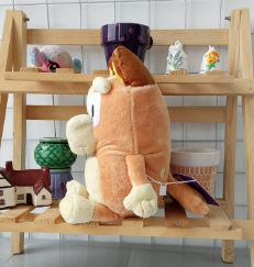 The image displays a plush toy of Bingo, a character from the popular children's animated television series Bluey, placed on a wooden shelf. Bingo is depicted as a red heeler dog, known for her playful and curious nature in the show. The plush toy is designed to be soft and cuddly, making it suitable for children to hug and play with. The image also shows other decorative items on the shelf, including a small house figurine and a green patterned pot.