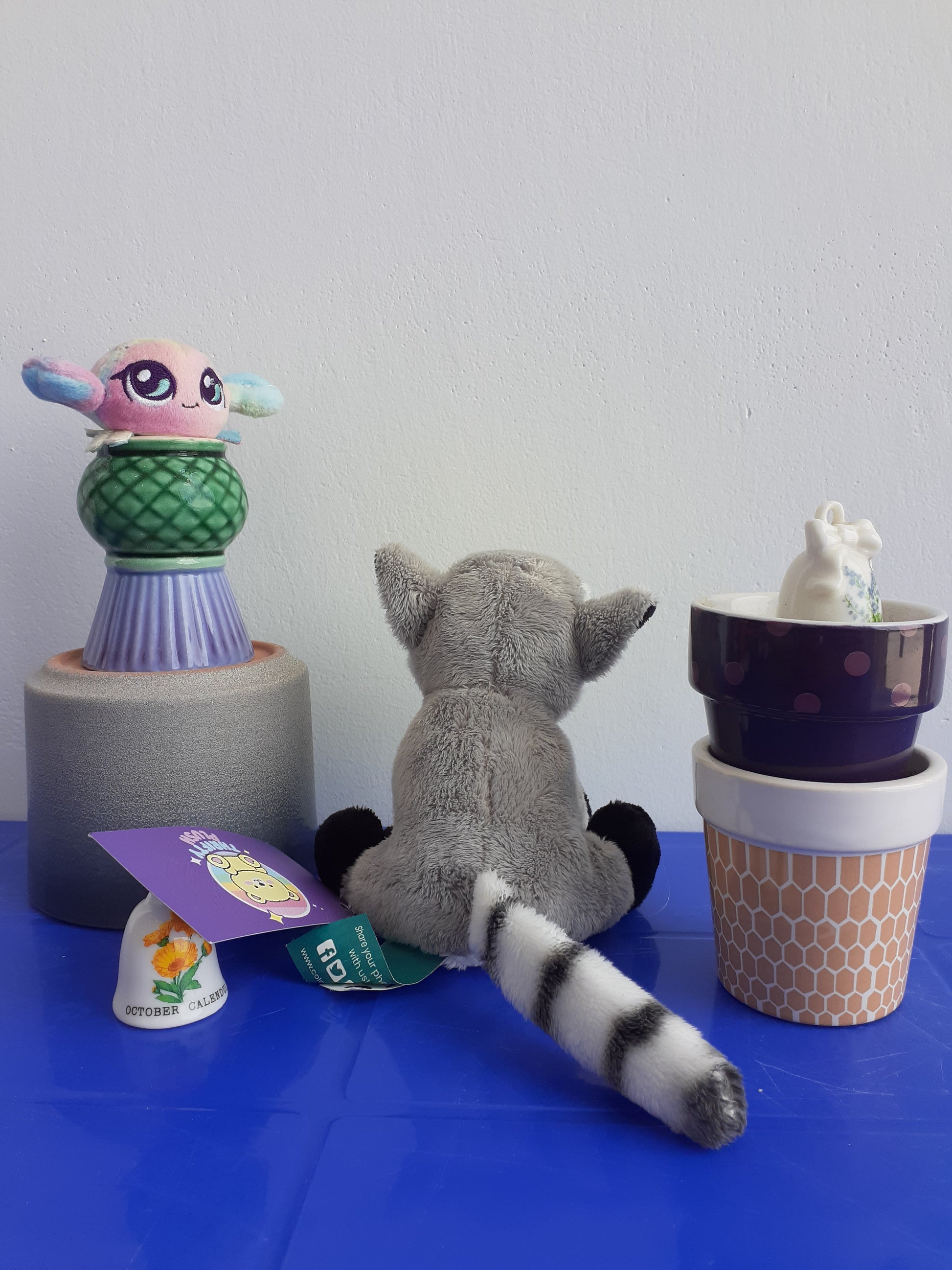 plush toy resembling a Ring-tailed Lemur, a primate known for its distinctive black and white striped tail.