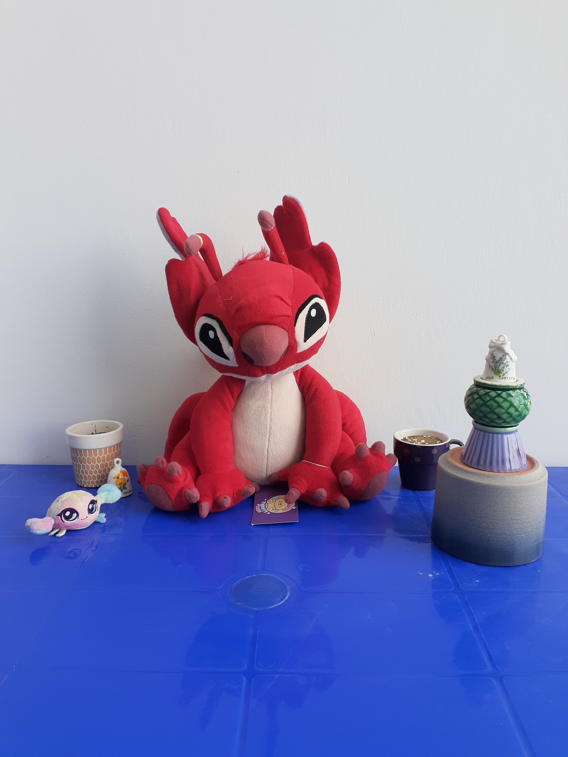 plush toy of Leroy from Disney's "Lilo & Stitch" franchise. Leroy is a red version of Stitch, created by Dr. Jumba Jookiba as Experiment 629. He's designed to be a destructive force, but he also has a softer side.