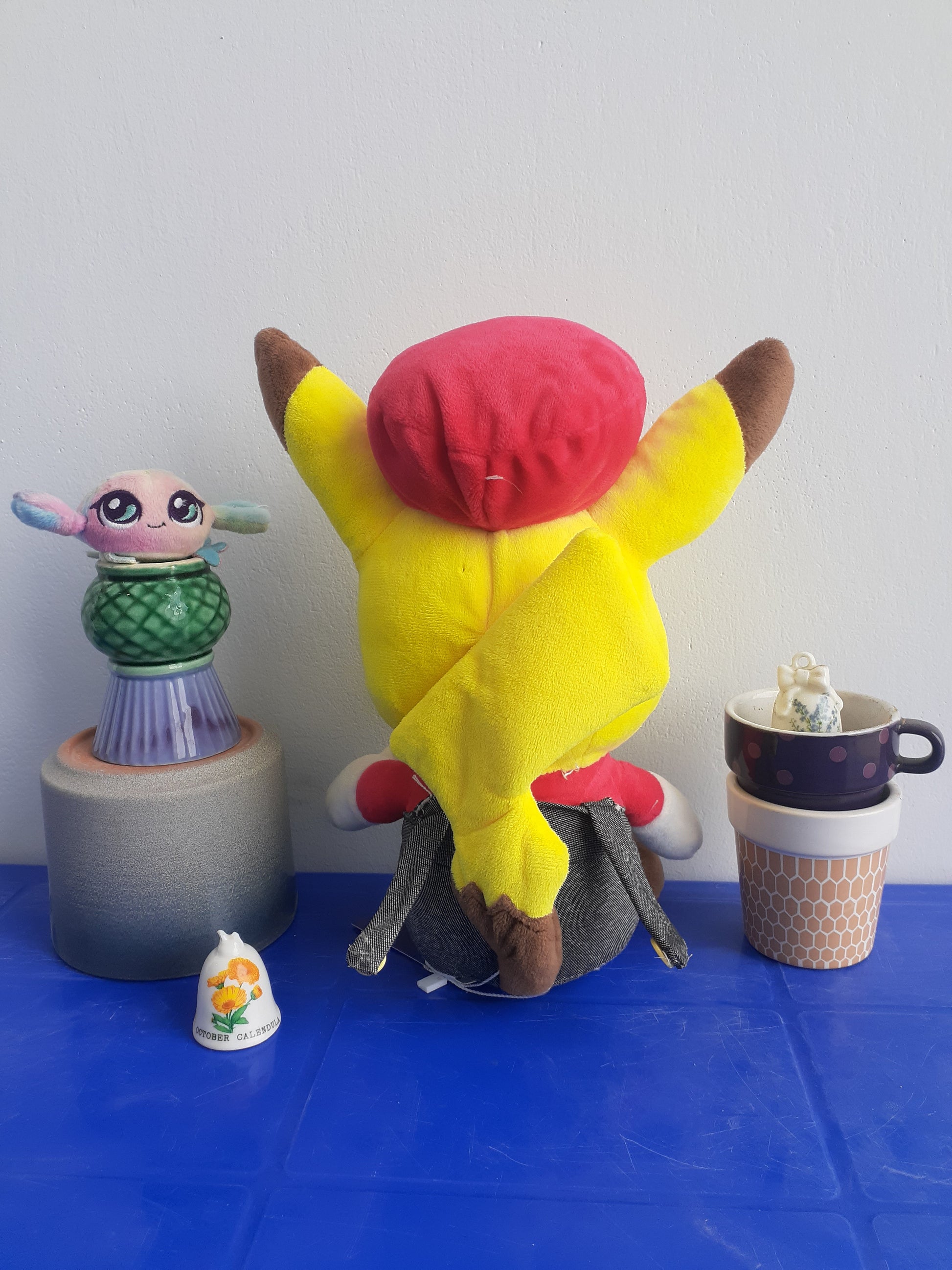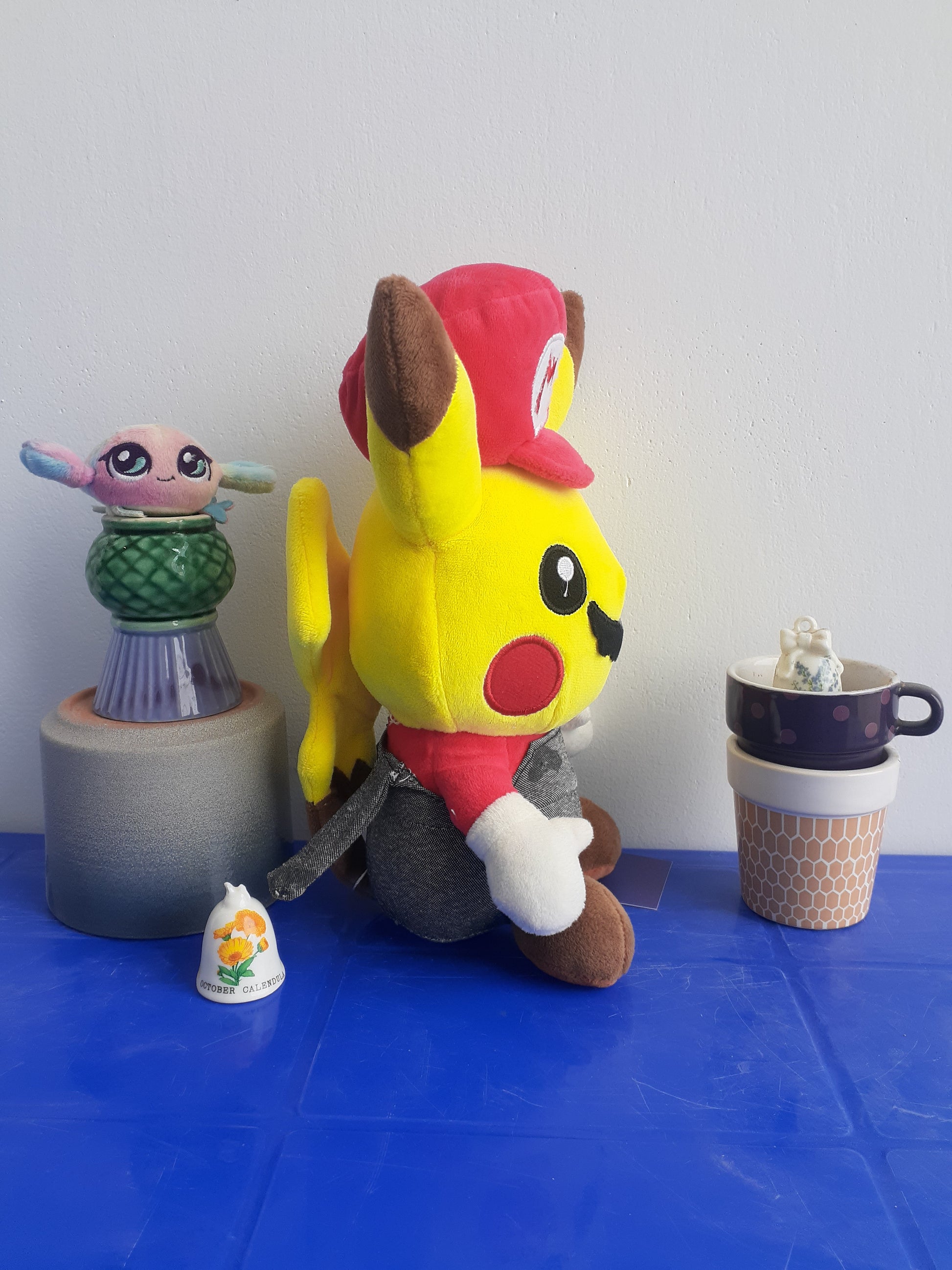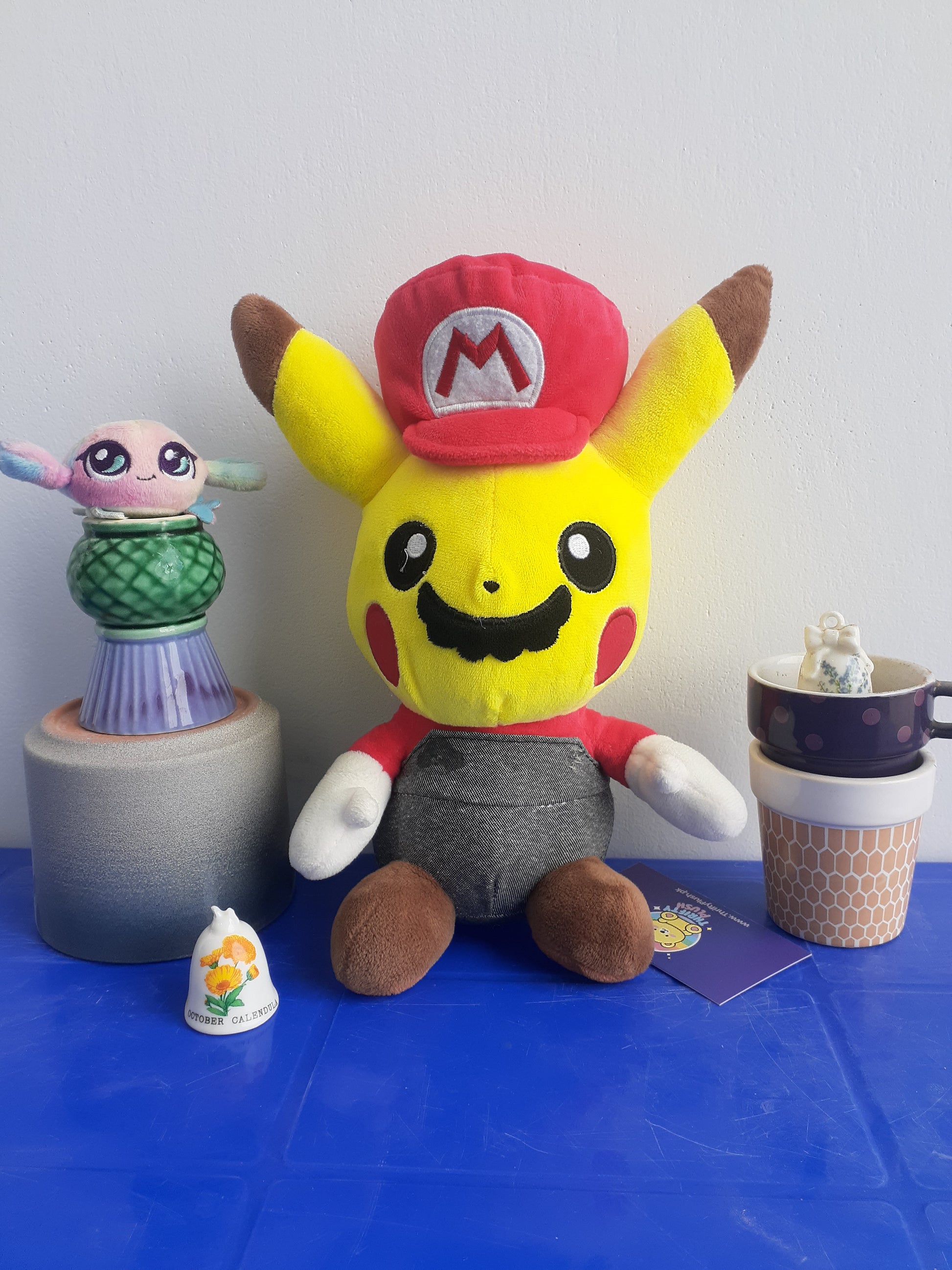 Pokémon Center Plush of Pikachu dressed as Mario, a collaboration between the Pokémon and Super Mario franchises. It was originally released in October 2016 and was exclusive to Pokémon Center Japan.