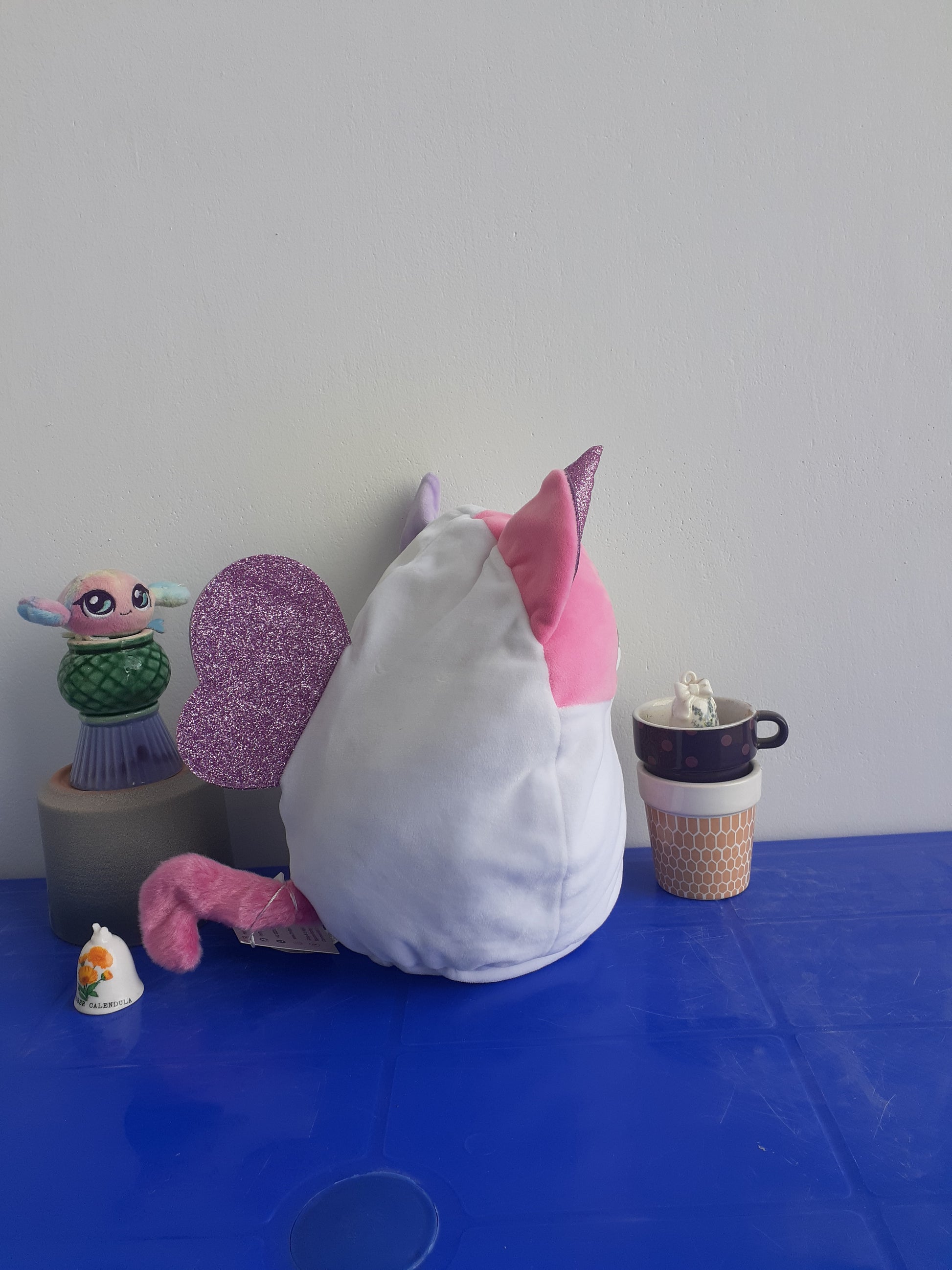 The toy is a white, round plush with a pink and purple unicorn horn and ears. It has a glittery heart on its belly with a cartoon fried egg design.