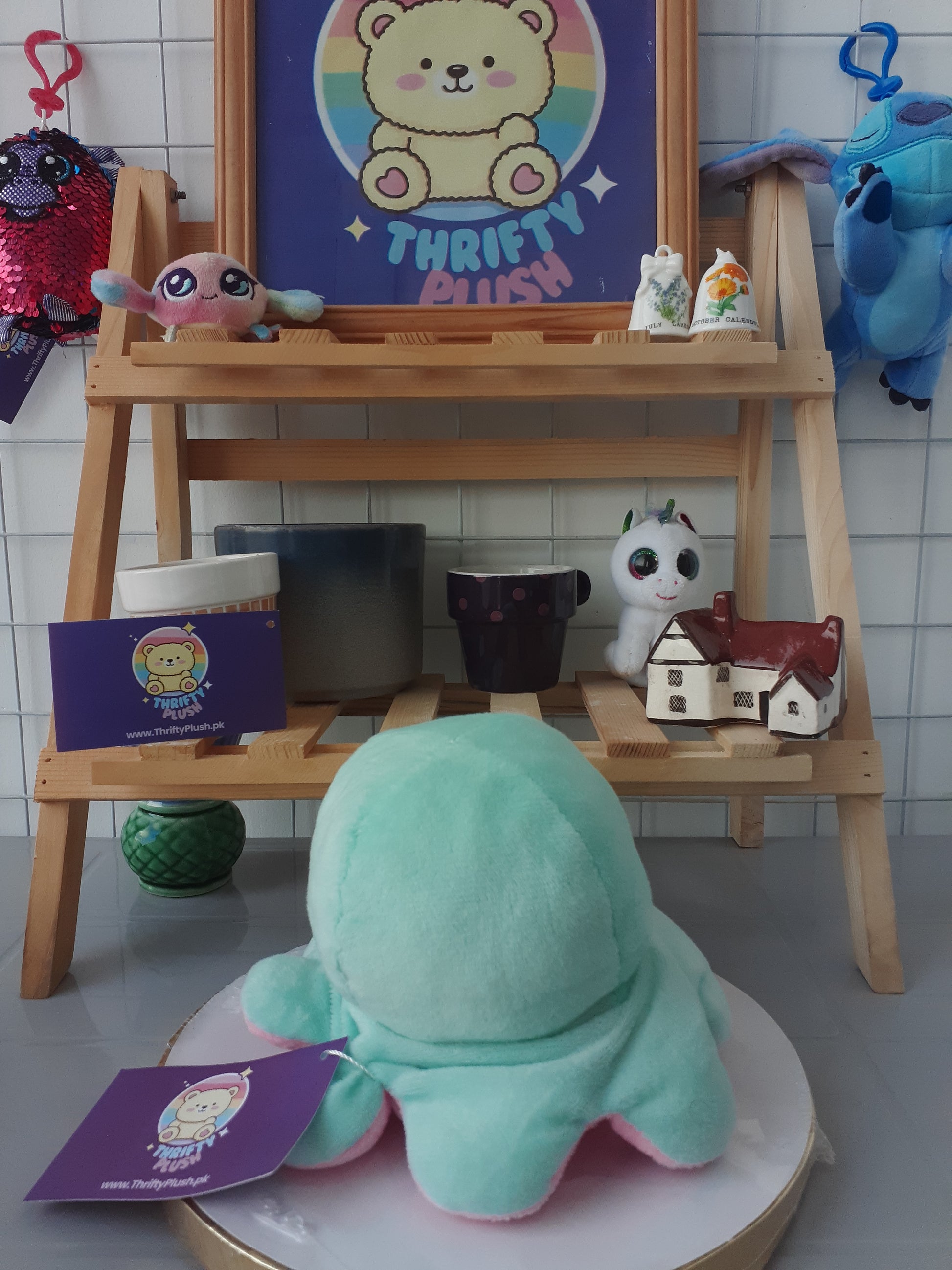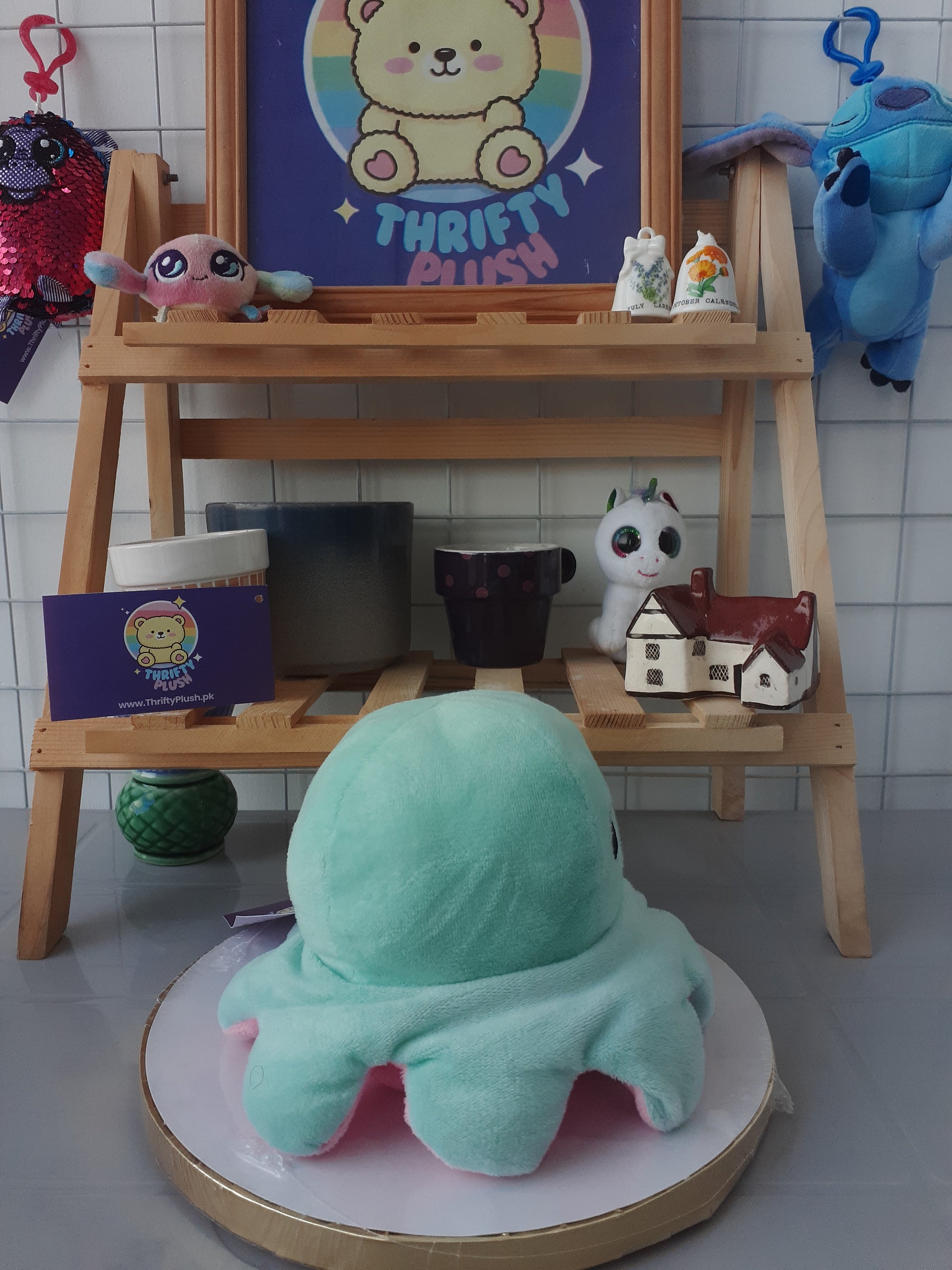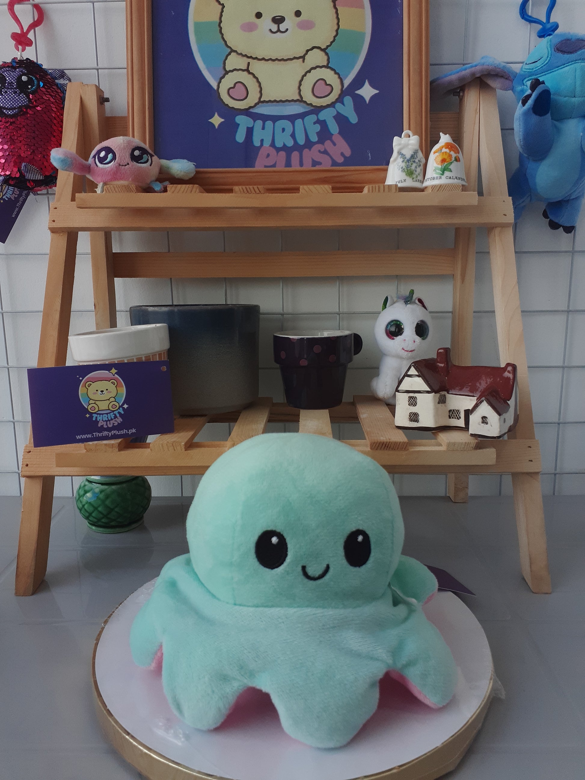 reversible octopus plush toy, known for its ability to flip between two different facial expressions, usually happy and sad. This particular one is light blue with a pink underside.