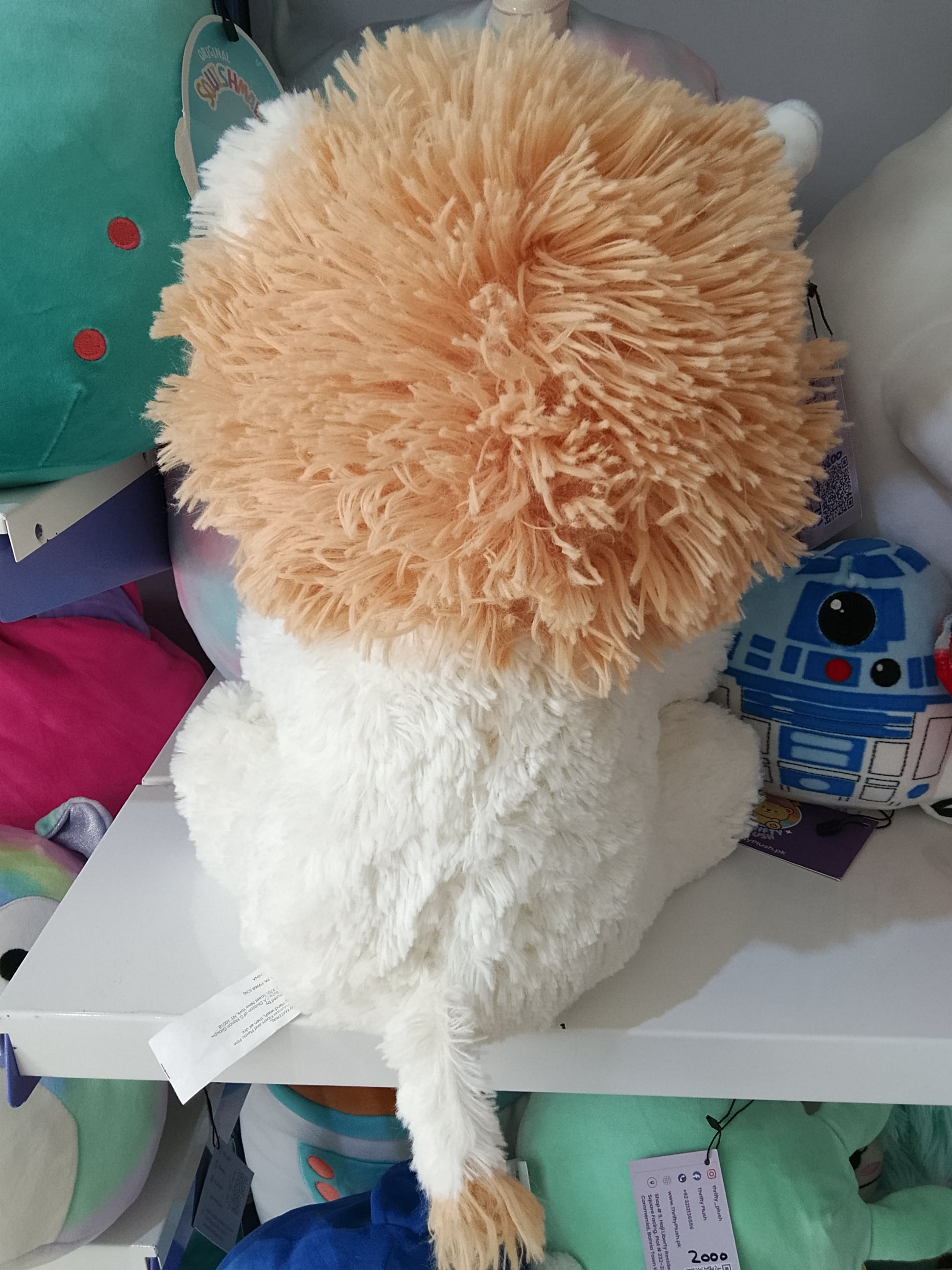 Appearance: The lion features a white face and body with a fluffy, light brown/tan mane and paws. It has an embroidered nose and eyes, giving it a friendly, lovable expression.
