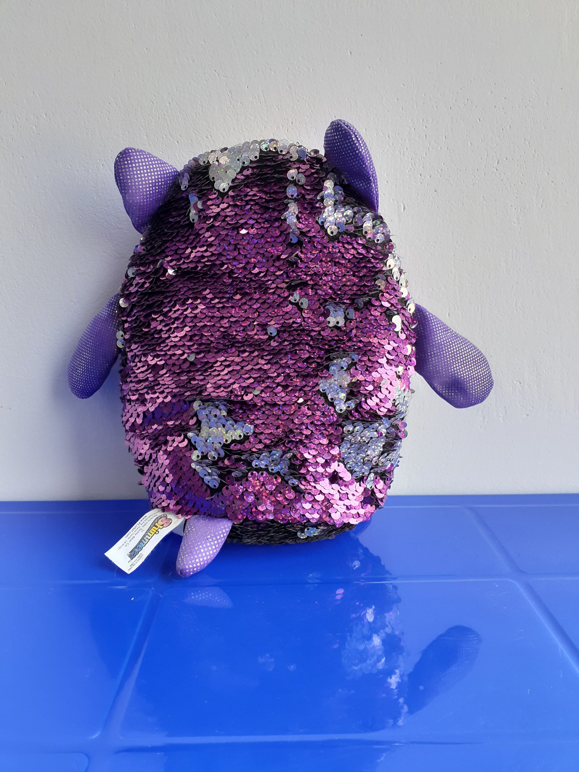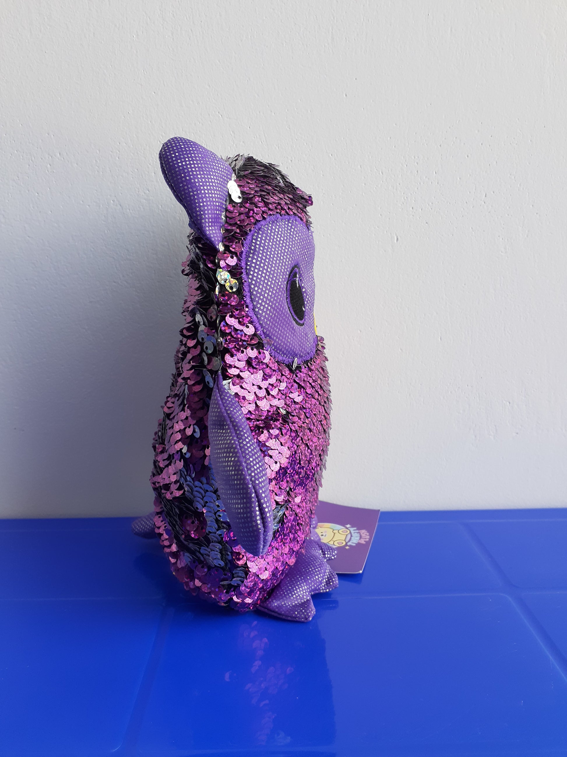 Shimmeez 8-inch Oliver Owl plush toy. This toy is part of the Shimmeez line, known for its reversible sequins that change color when brushed. Key features include:
