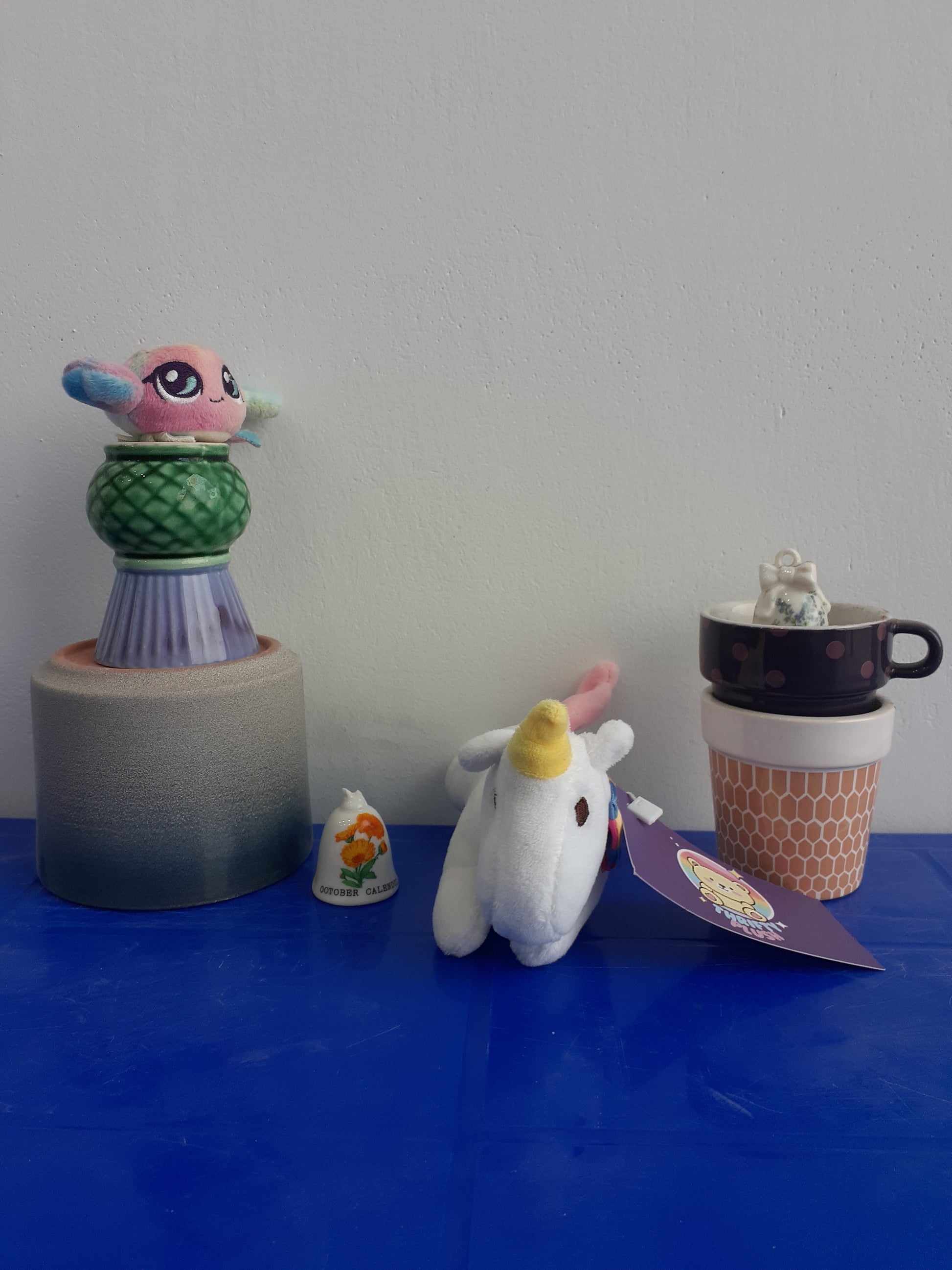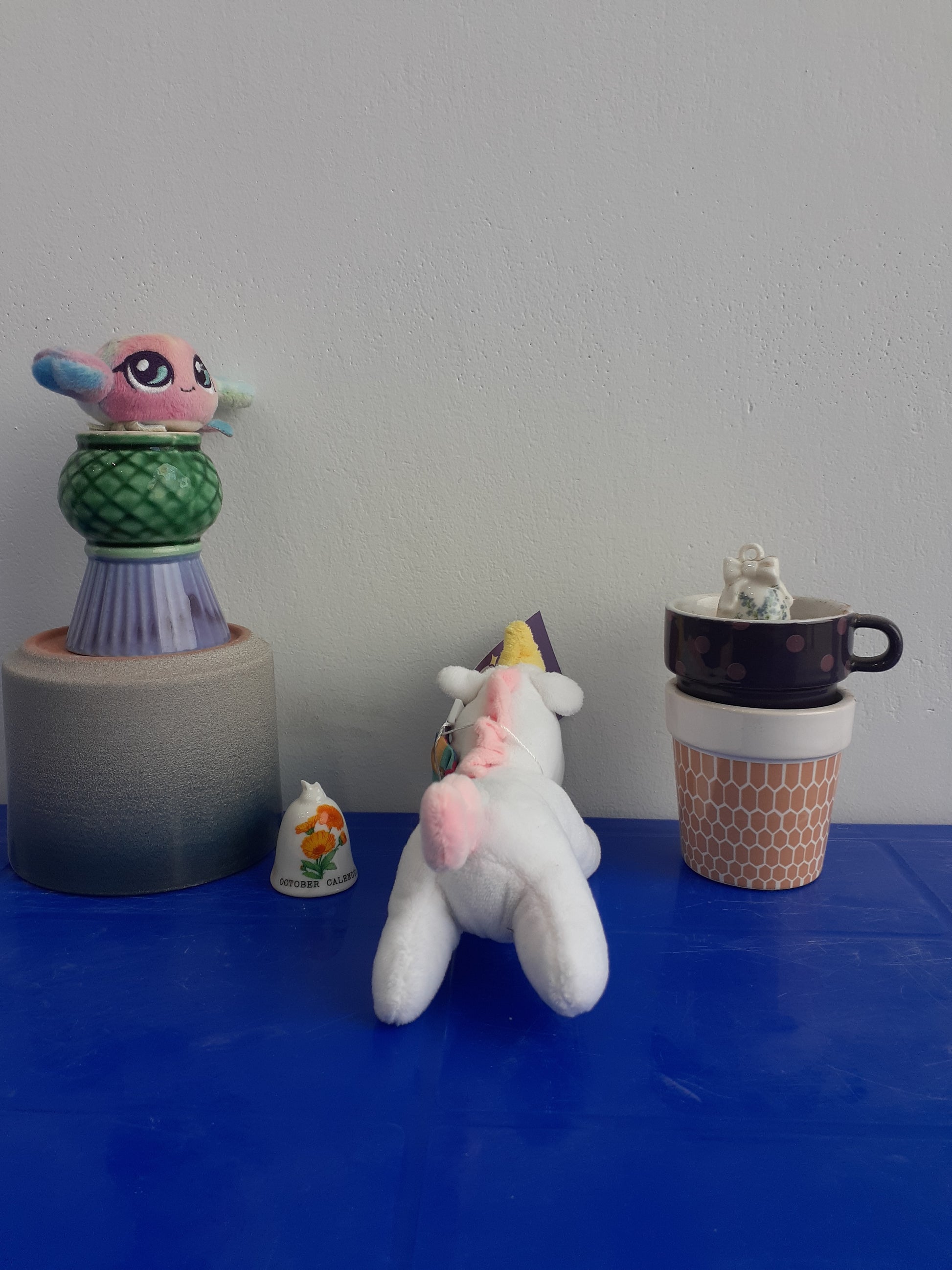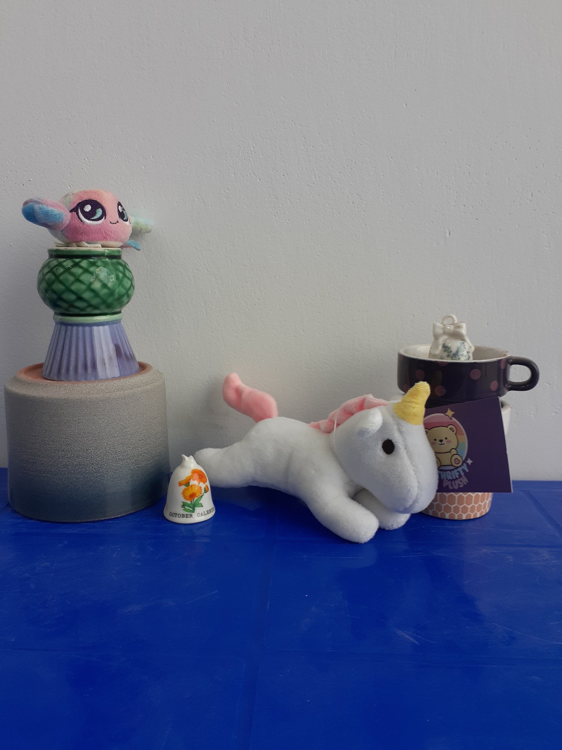Mystic is typically white with a yellow horn and a pink yarn mane. Some versions have an iridescent horn and a coarse yarn mane.