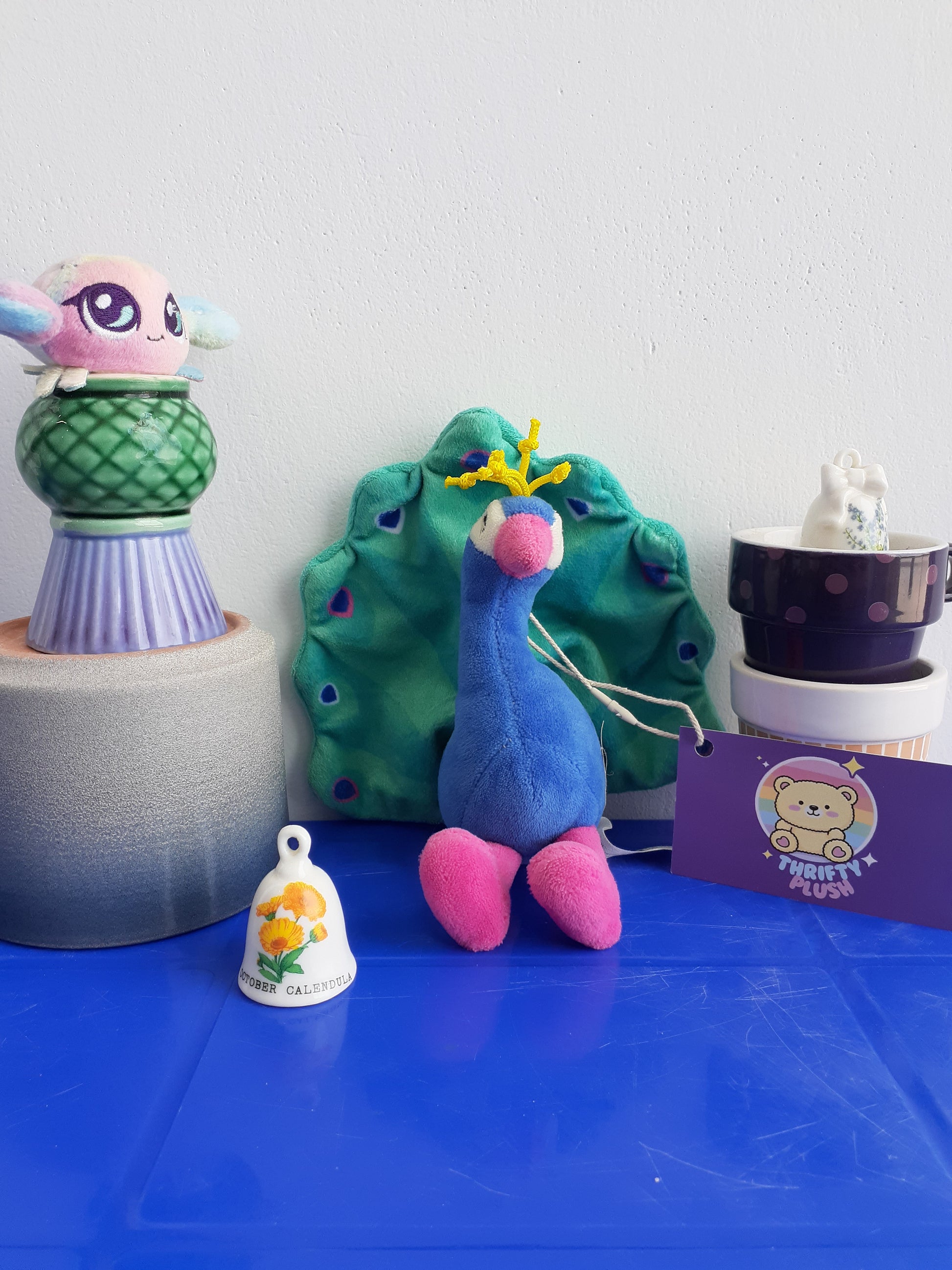 Soframar Warmies Cozy Bouillotte Plush Paon, which is a microwavable plush toy designed to provide warmth and comfort. It is filled with wheat kernels and scented with French lavender, offering a soothing effect. The toy is safe for both microwave and refrigerator use. The toy can be surface cleaned with a damp cloth, but should not be immersed in water.