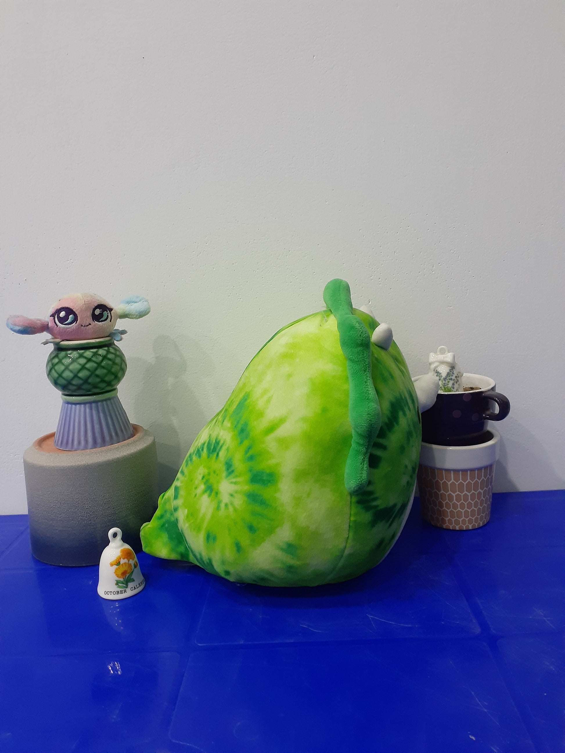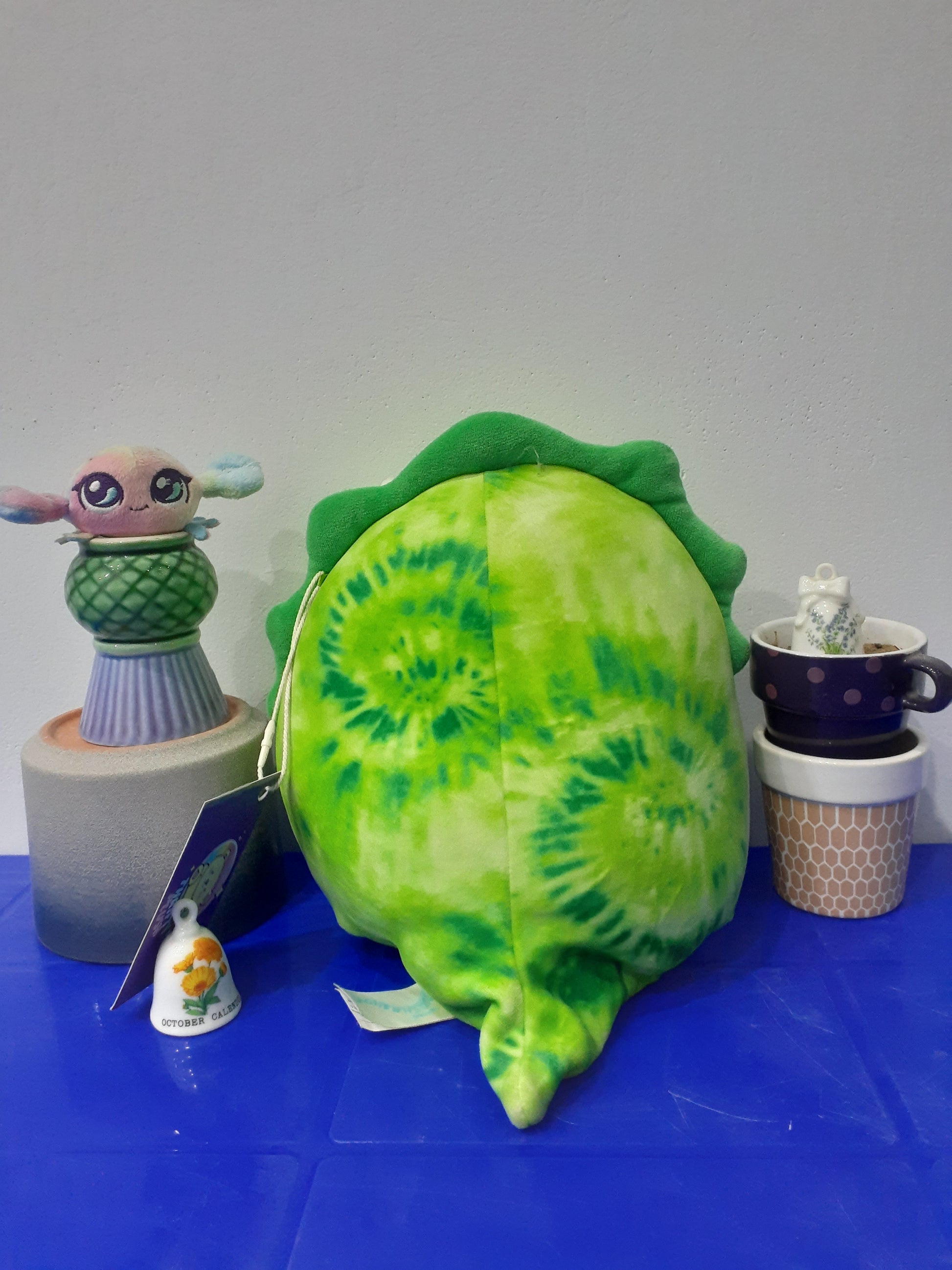 Squishmallow, which is a brand of stuffed toy known for its soft, squishy, and huggable design. This particular Squishmallow is Rocio the Triceratops, identifiable by its green tie-dye pattern and three horns.