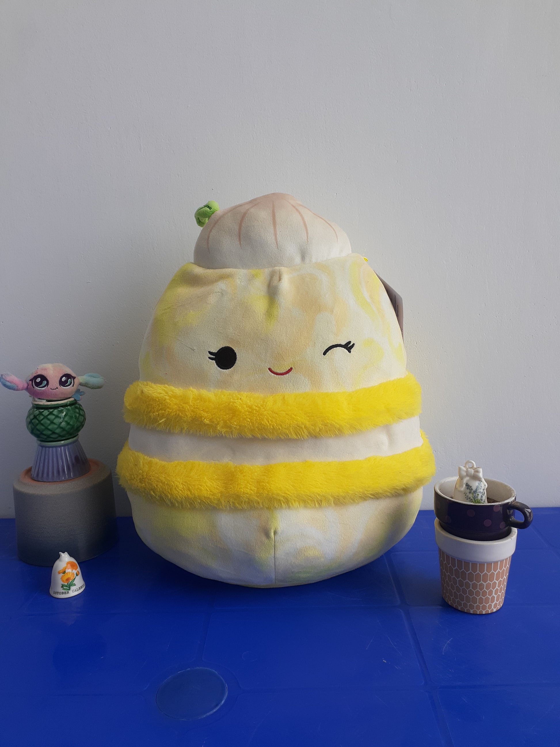 Design: It is designed to look like a yellow meringue macaron with a cute face and a winking eye.