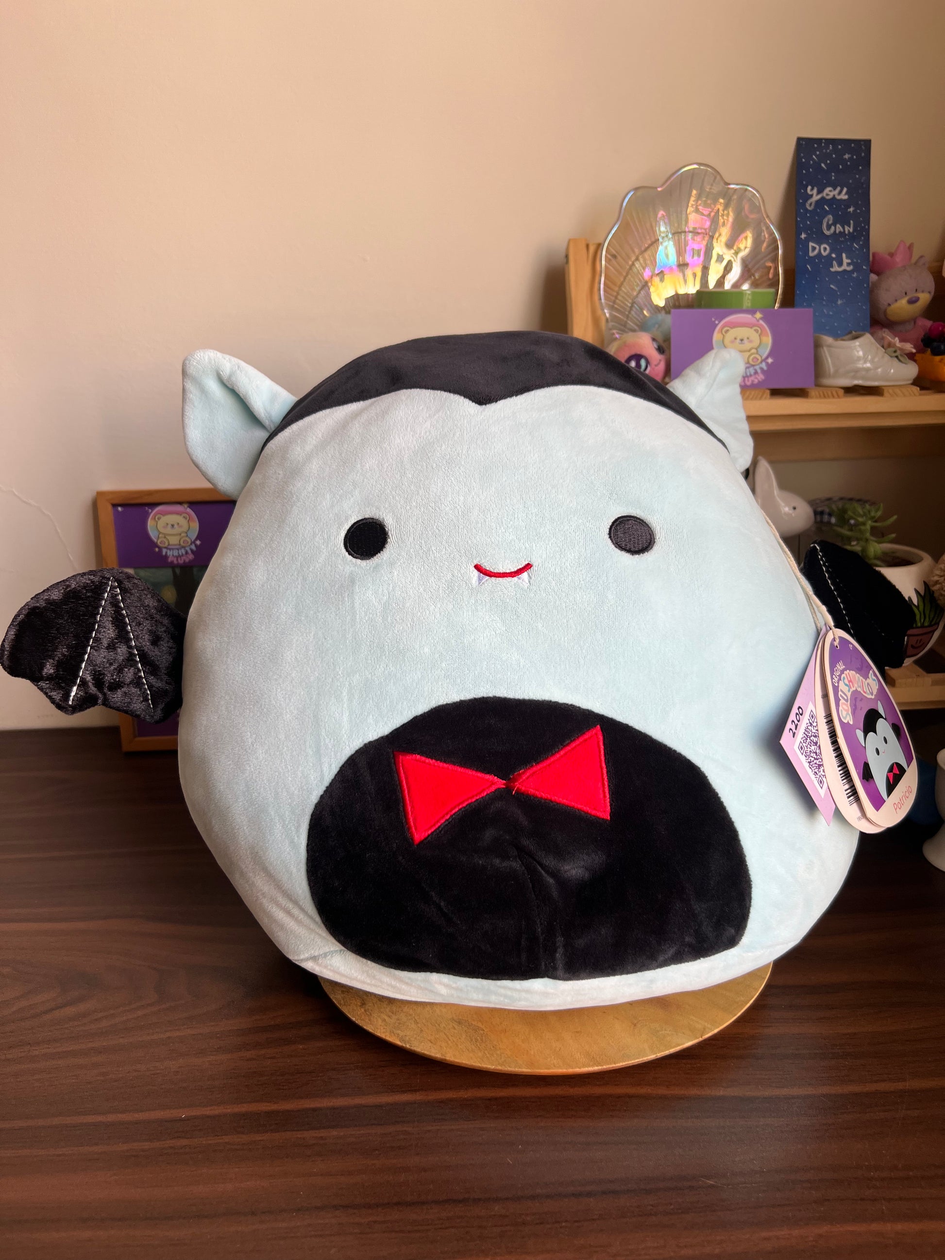 Character: Patricio the Vampire, a pale blue Squishmallow with black hair and bat ears.