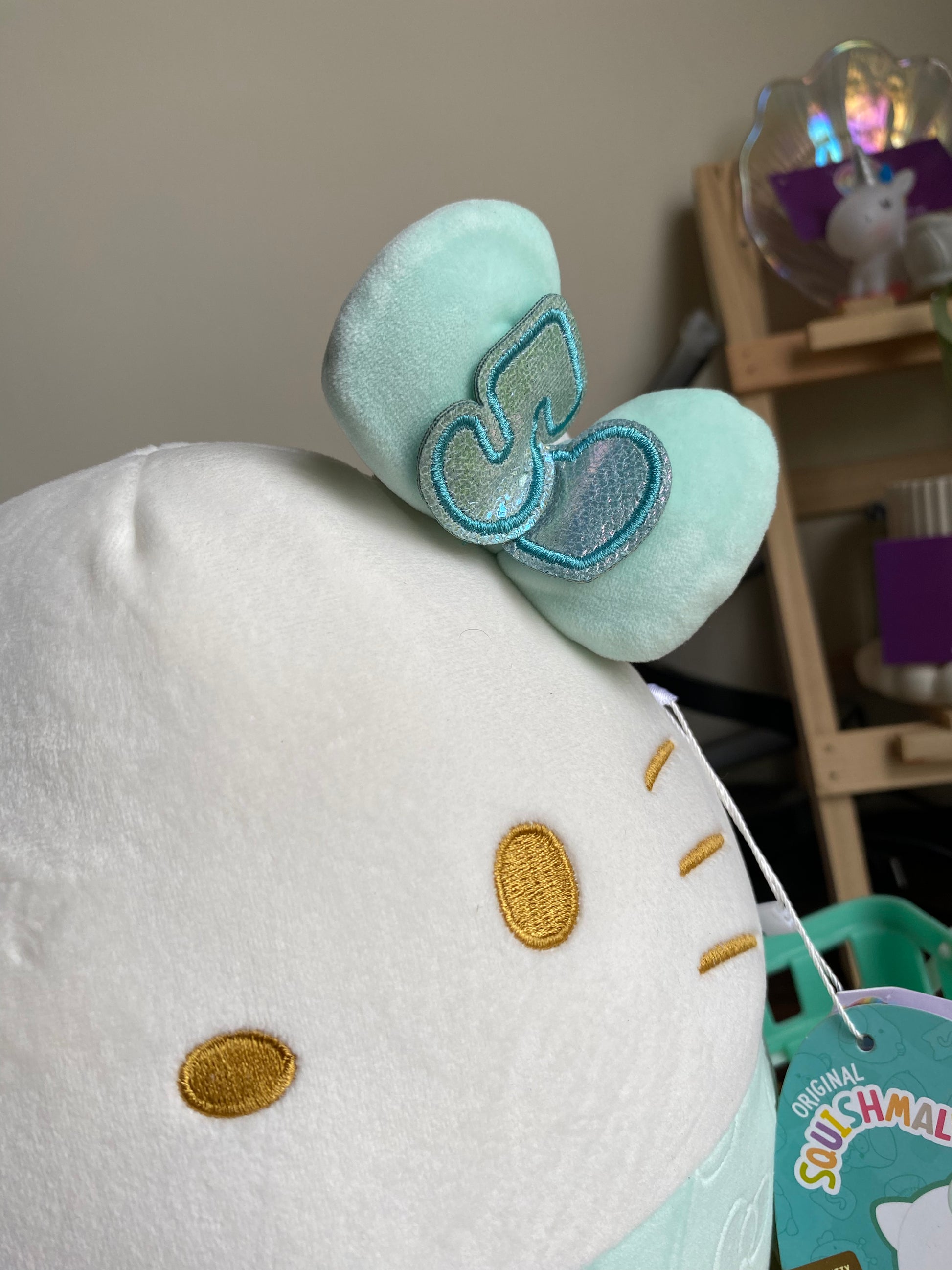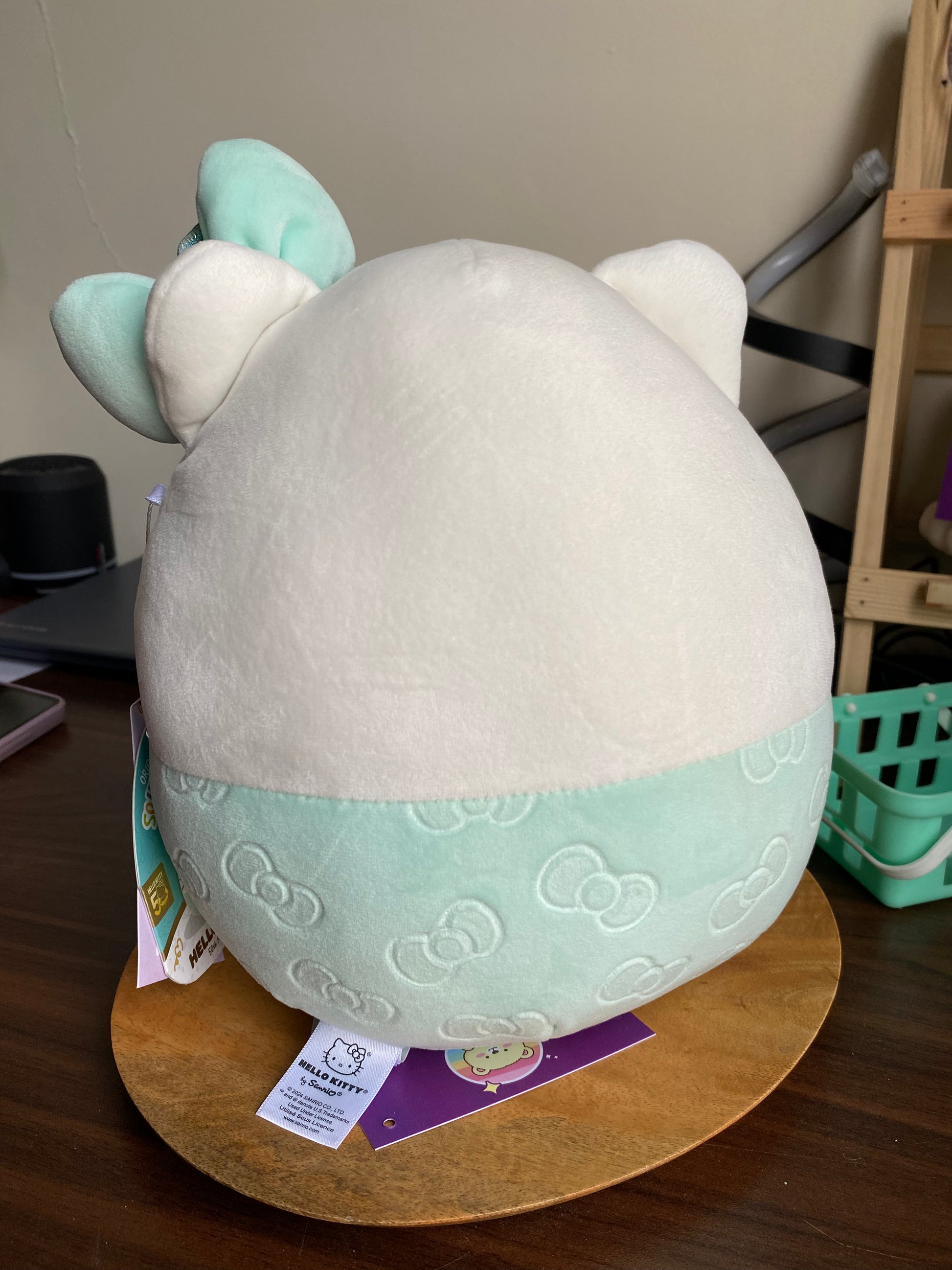 Celebrate Hello Kitty's 50th anniversary with the Squishmallows Green Bows plush. Made from marshmallow-like fabric and cozy polyester fibers, this 8-inch plush is irresistibly cuddly and machine-washable. Featuring a luxurious velvet bow, this officially licensed Hello Kitty Squishmallow will bring joy to all ages. Sanrio Hello Kitty