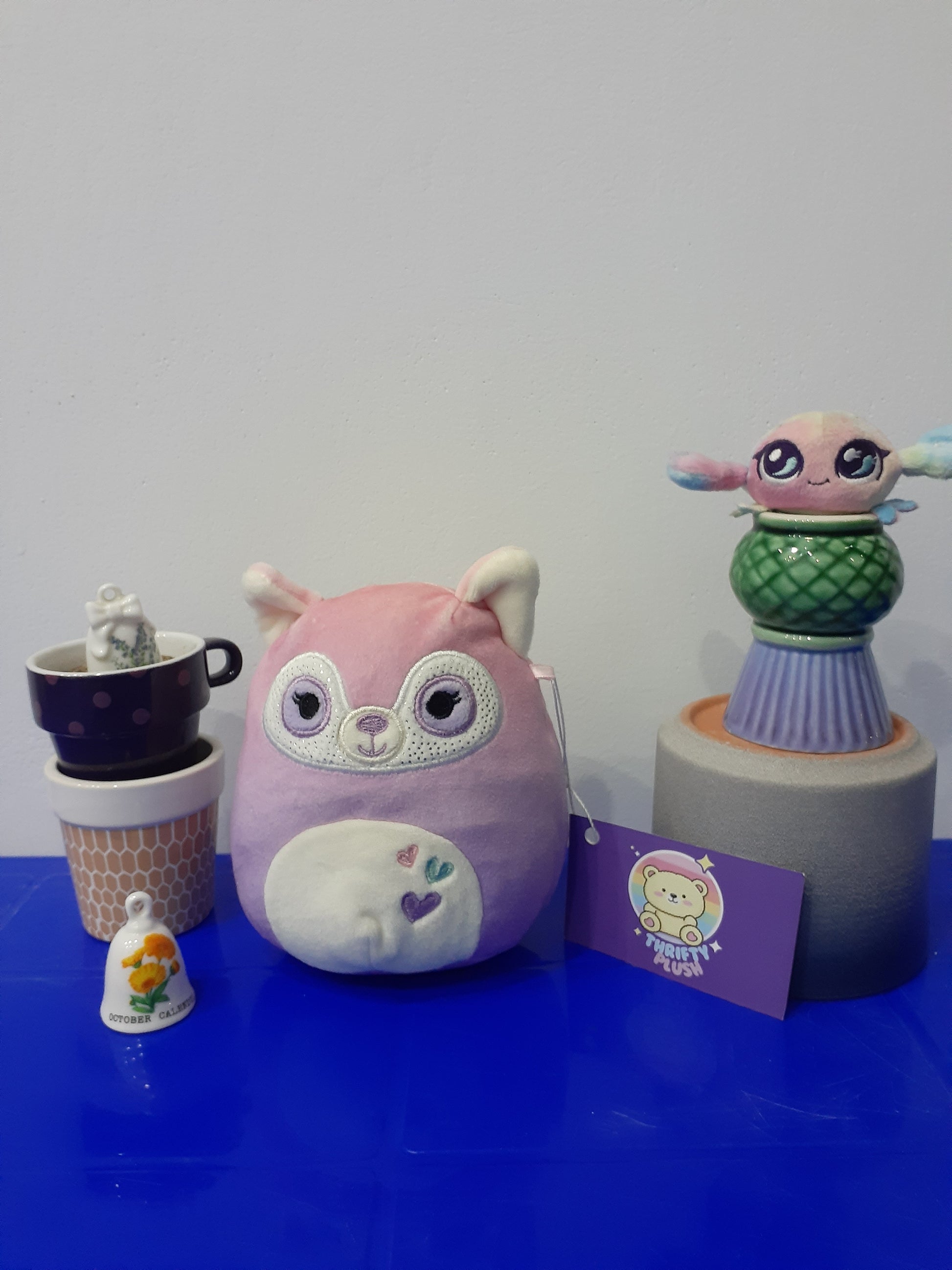 Squishmallows plush toy named Chaitra, a pink and purple lemur. Squishmallows are known for their soft, squishy texture and are popular among both children and adults.