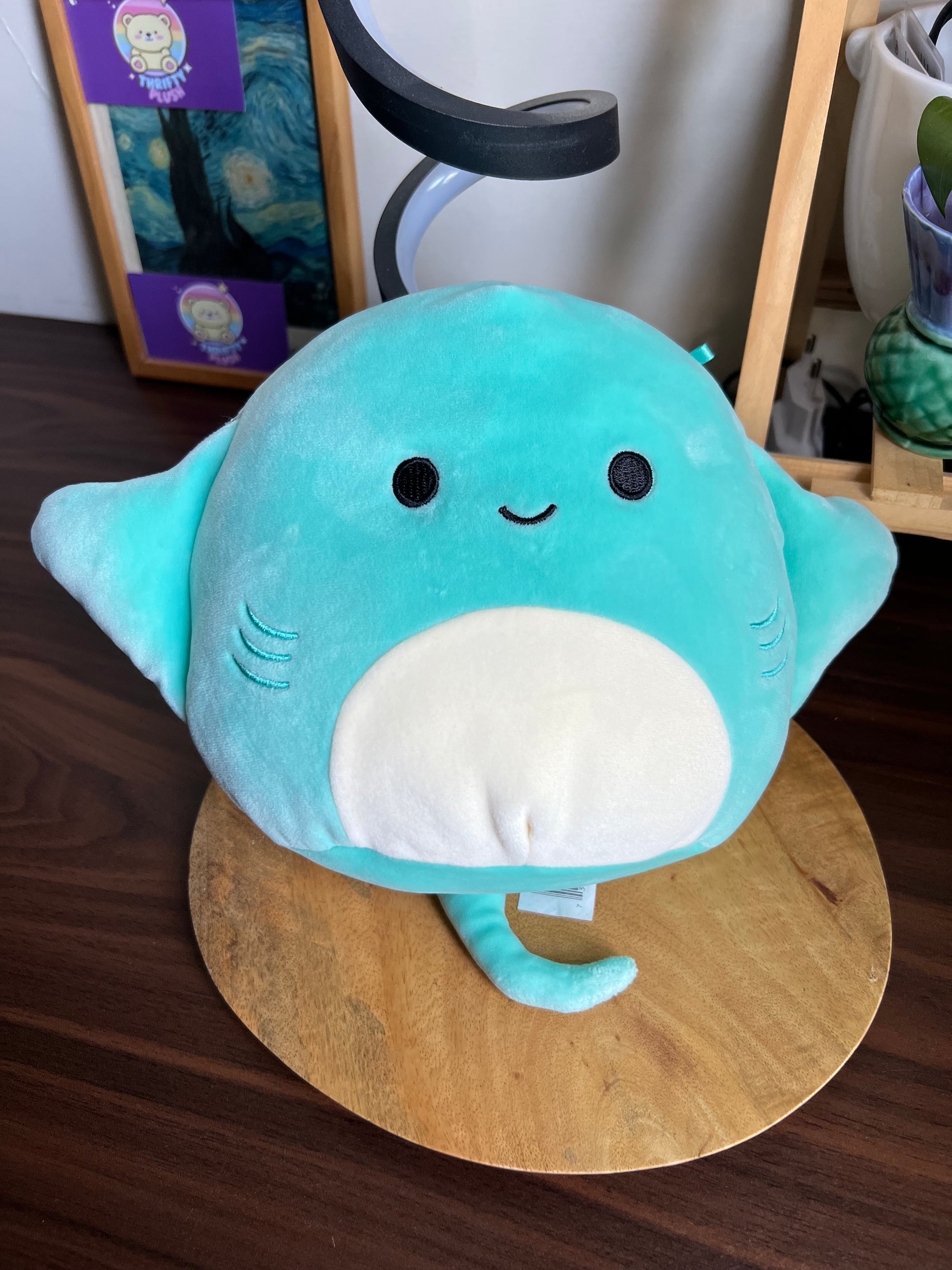 Squishmallows 7.5" Maggie the Stingray plush toy. It is teal with a cream-colored belly and black eyes and a smile. Squishmallows are popular for their soft, squishy texture and colorful designs, offering comfort and sensory stimulation. Maggie the Stingray, like other Squishmallows, has a unique personality