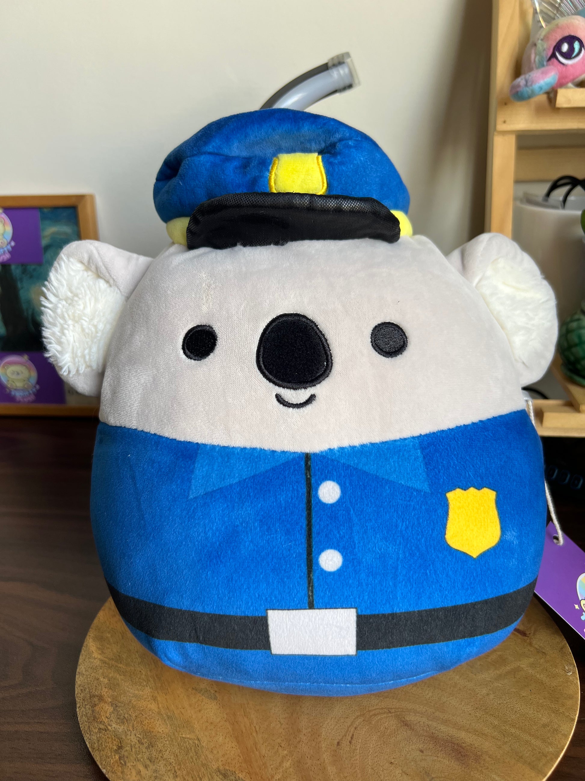 Squishmallows plush toy called Detective Kirk the Koala. It features a koala wearing a police uniform with a blue hat, jacket, black belt, and a gold badge.
