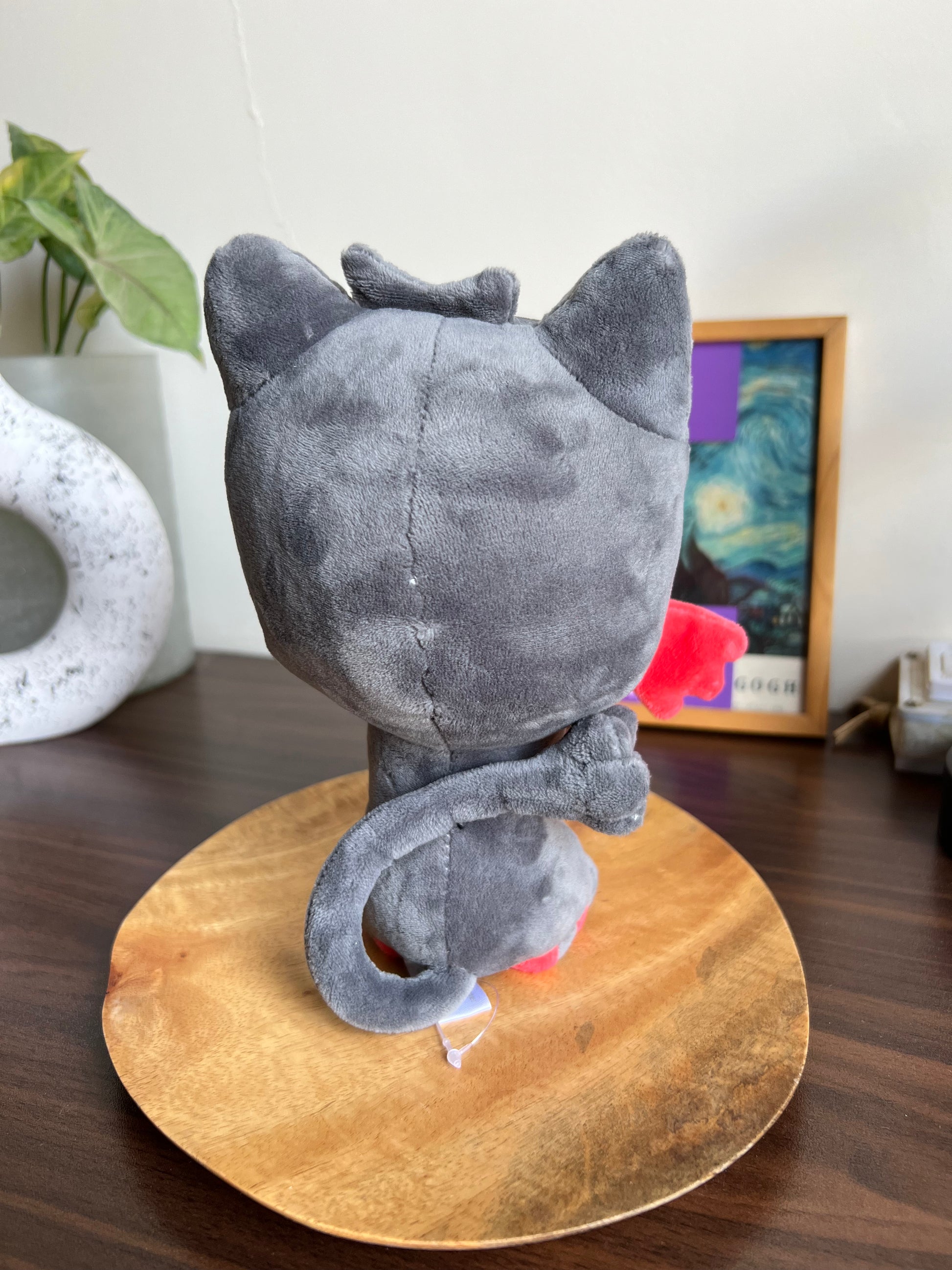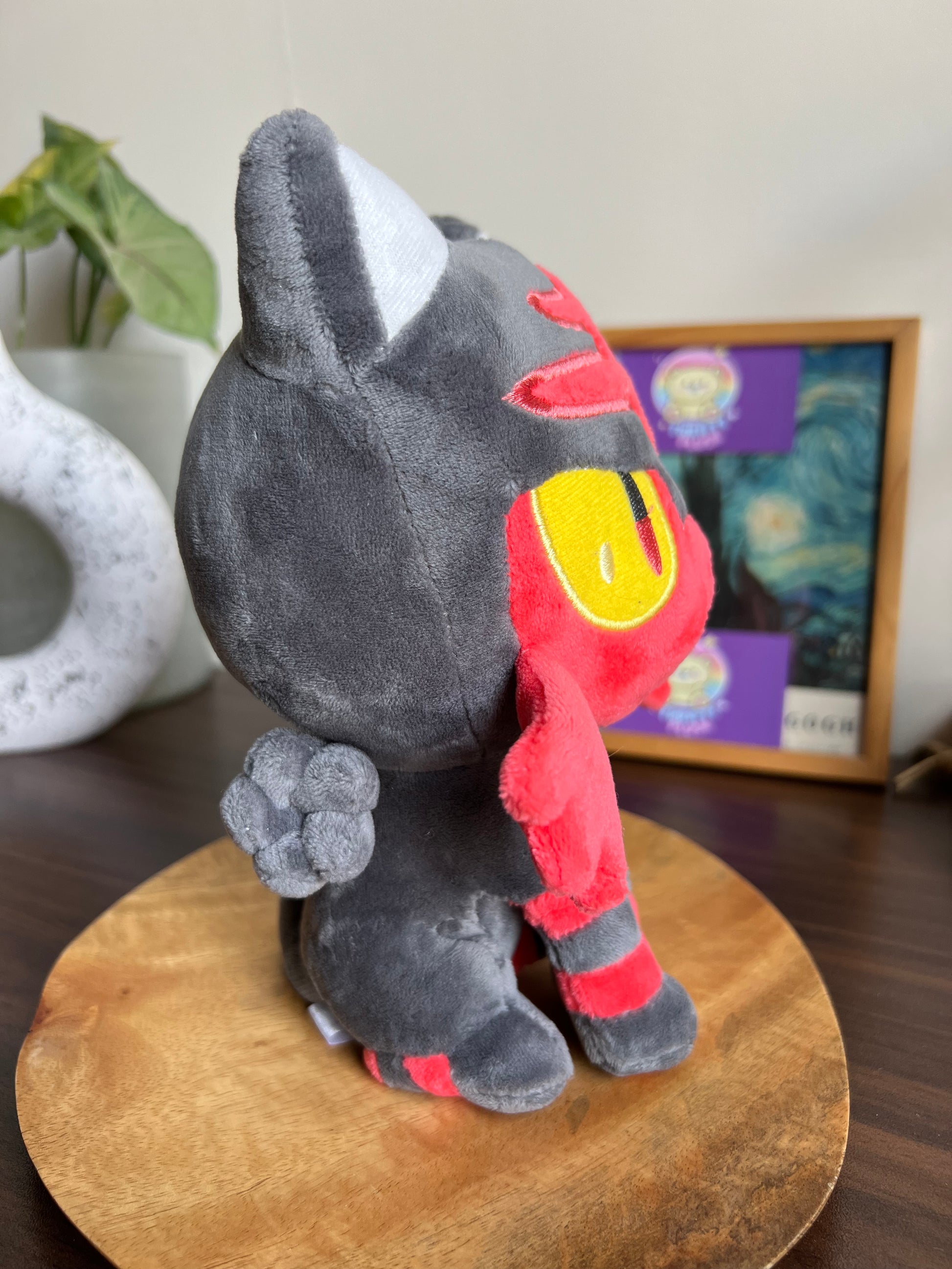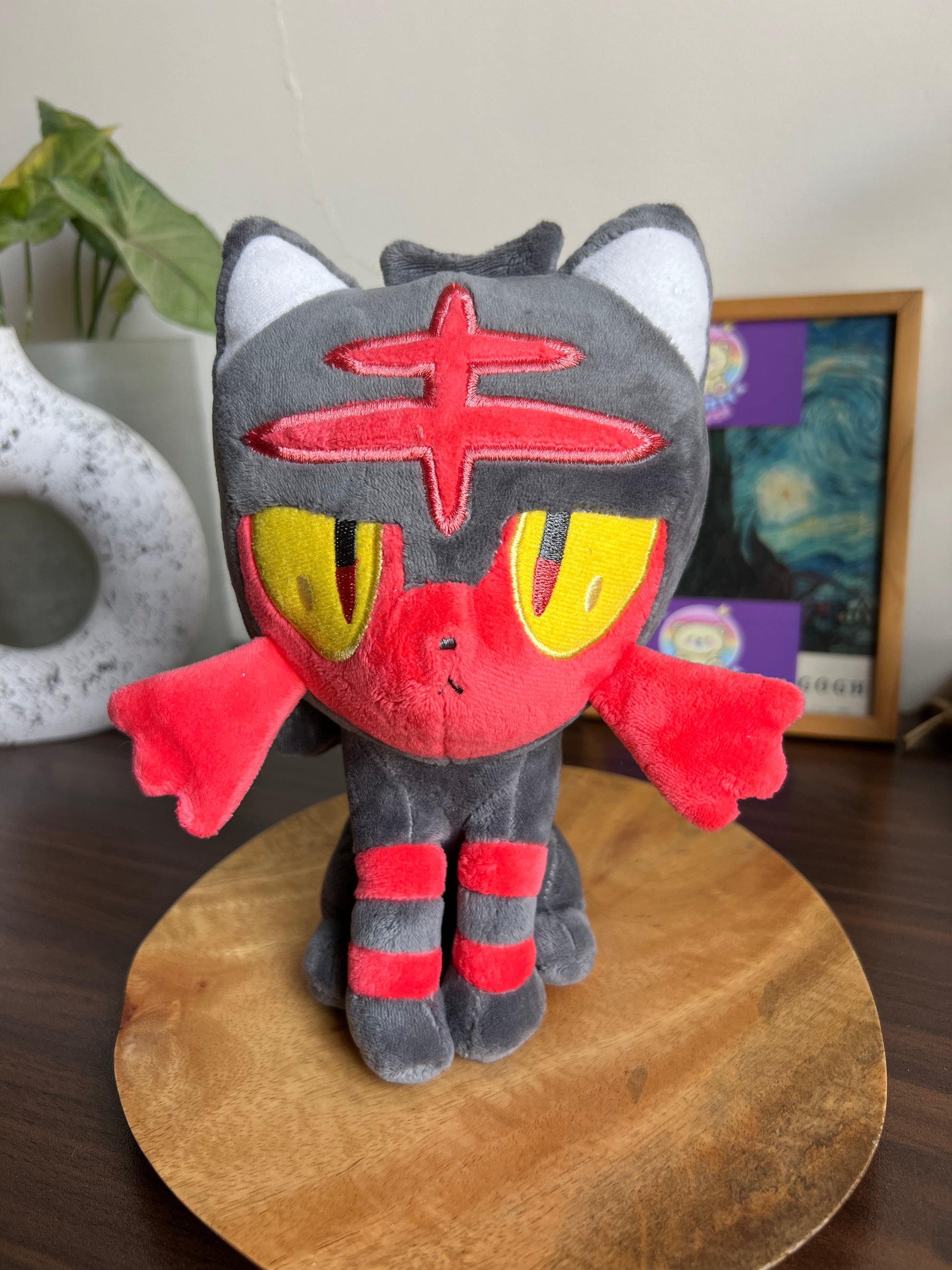 Litten plush toy, a fire-type Pokémon known for its black fur, red eyes, and tufts of fur on its face and tail. Litten's fur produces flammable oils, allowing it to spit fireballs and even burn off its fur when shedding. It evolves into Torracat and then into Incineroar. Litten is also a baby name of English origin meaning "settlement on the hill".