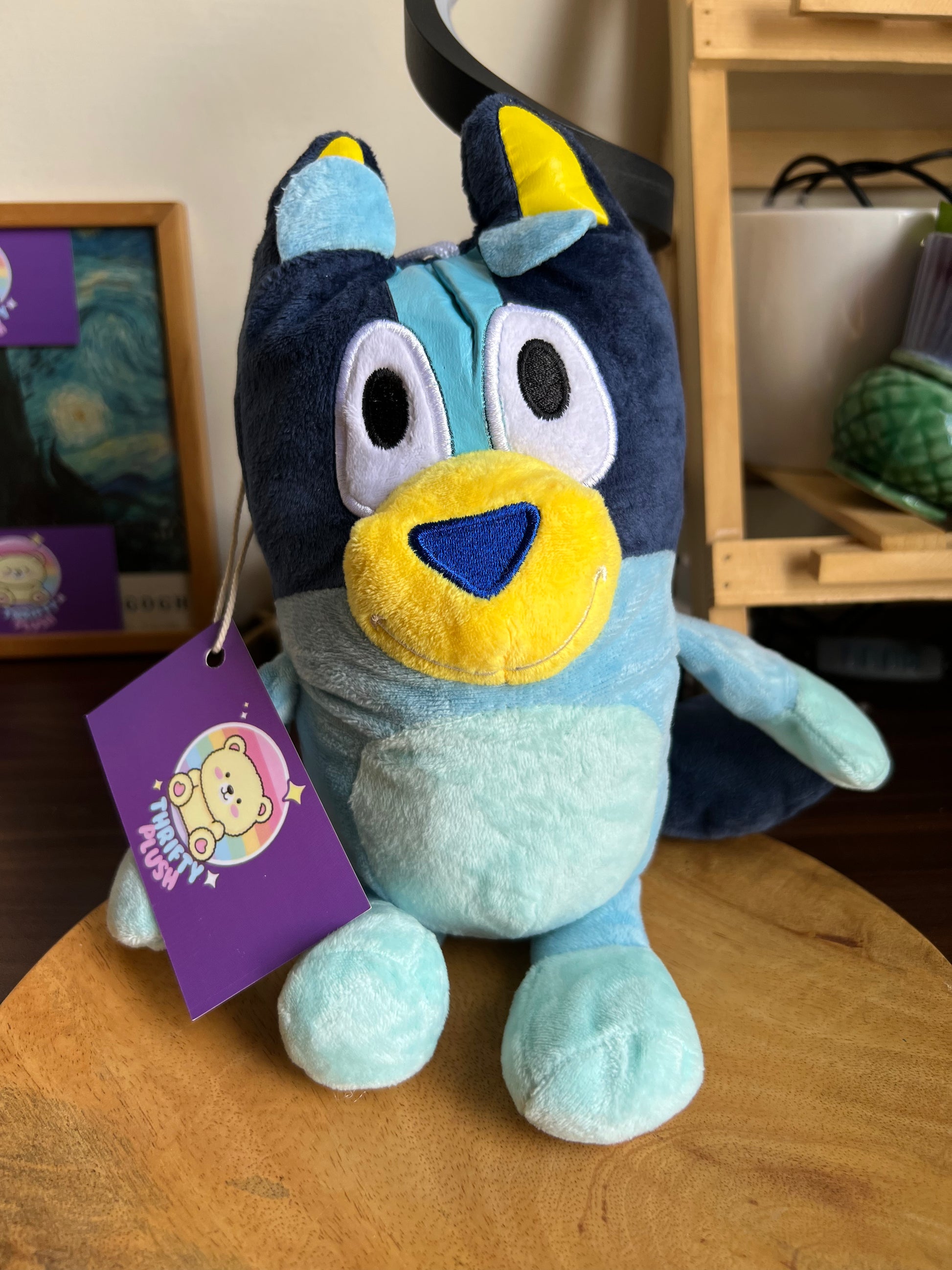 Bluey plush toy, a character from the popular children's show "Bluey". Bluey is a six-year-old Blue Heeler puppy who loves to play and have adventures.