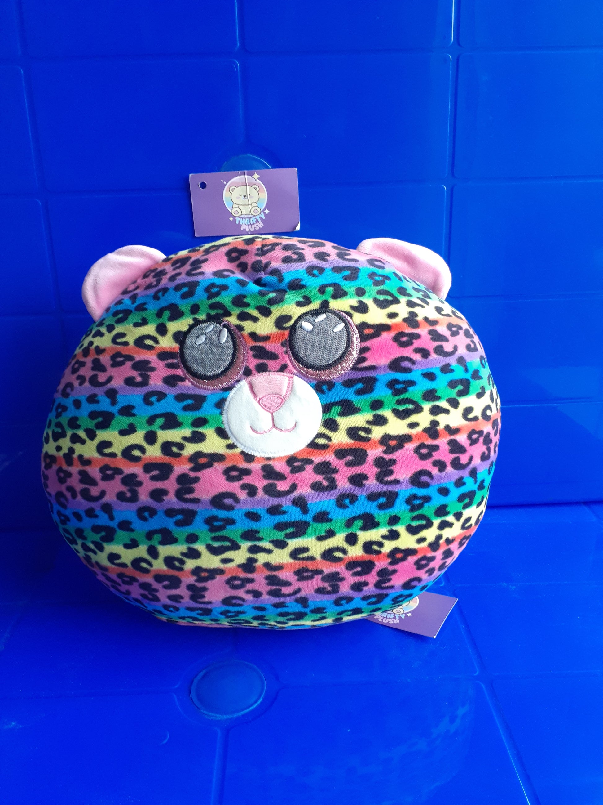 "TY Dotty Leopard Squish-A-Boo" or "TY Dotty Beanie Boos". It is a round, soft, and squishy plush toy designed to be cuddly and used as a cushion or pillow. Here's some information about it: