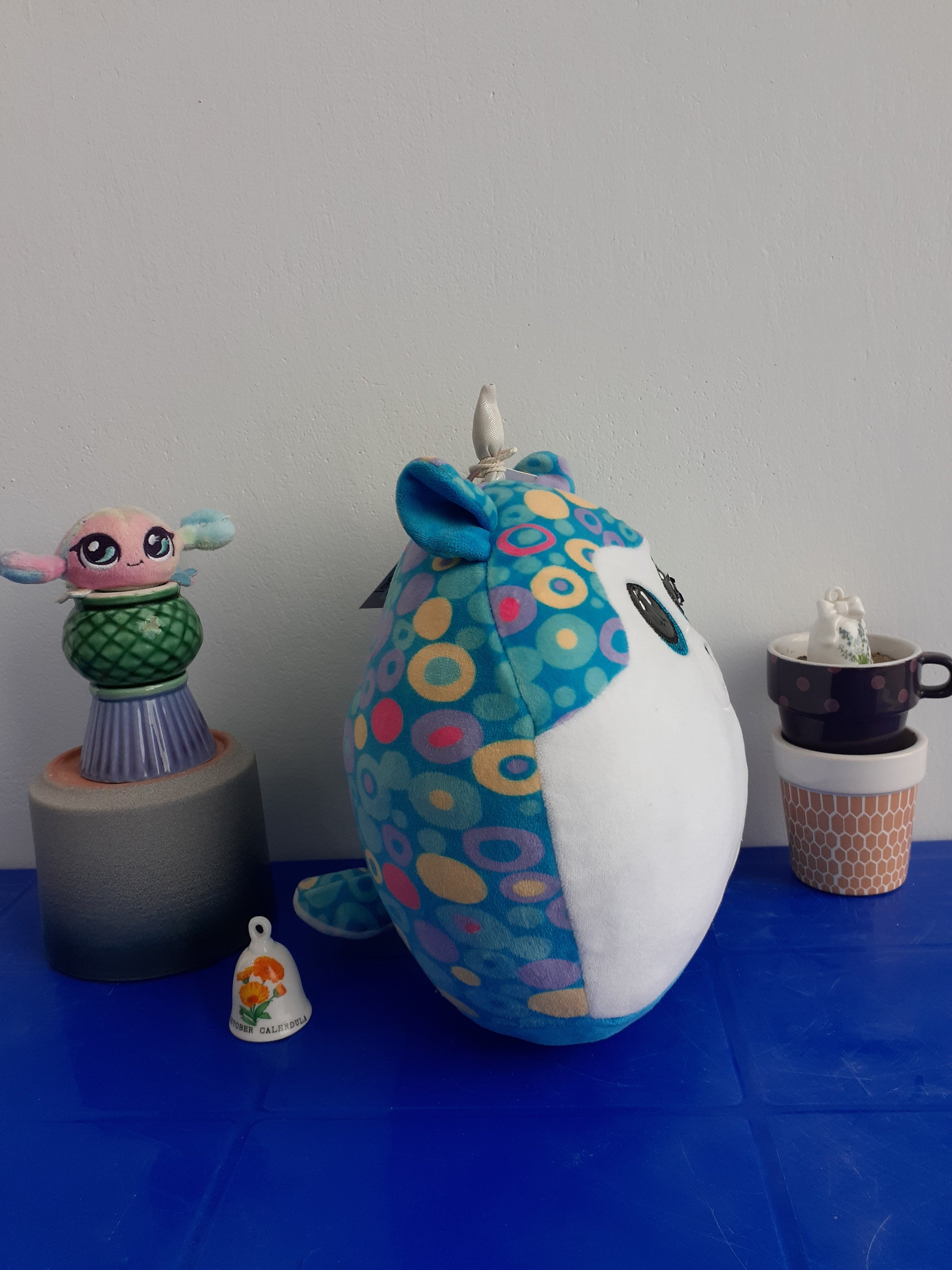 Design: It features a white body with blue accents, a blue horn, and glittery blue eyes.